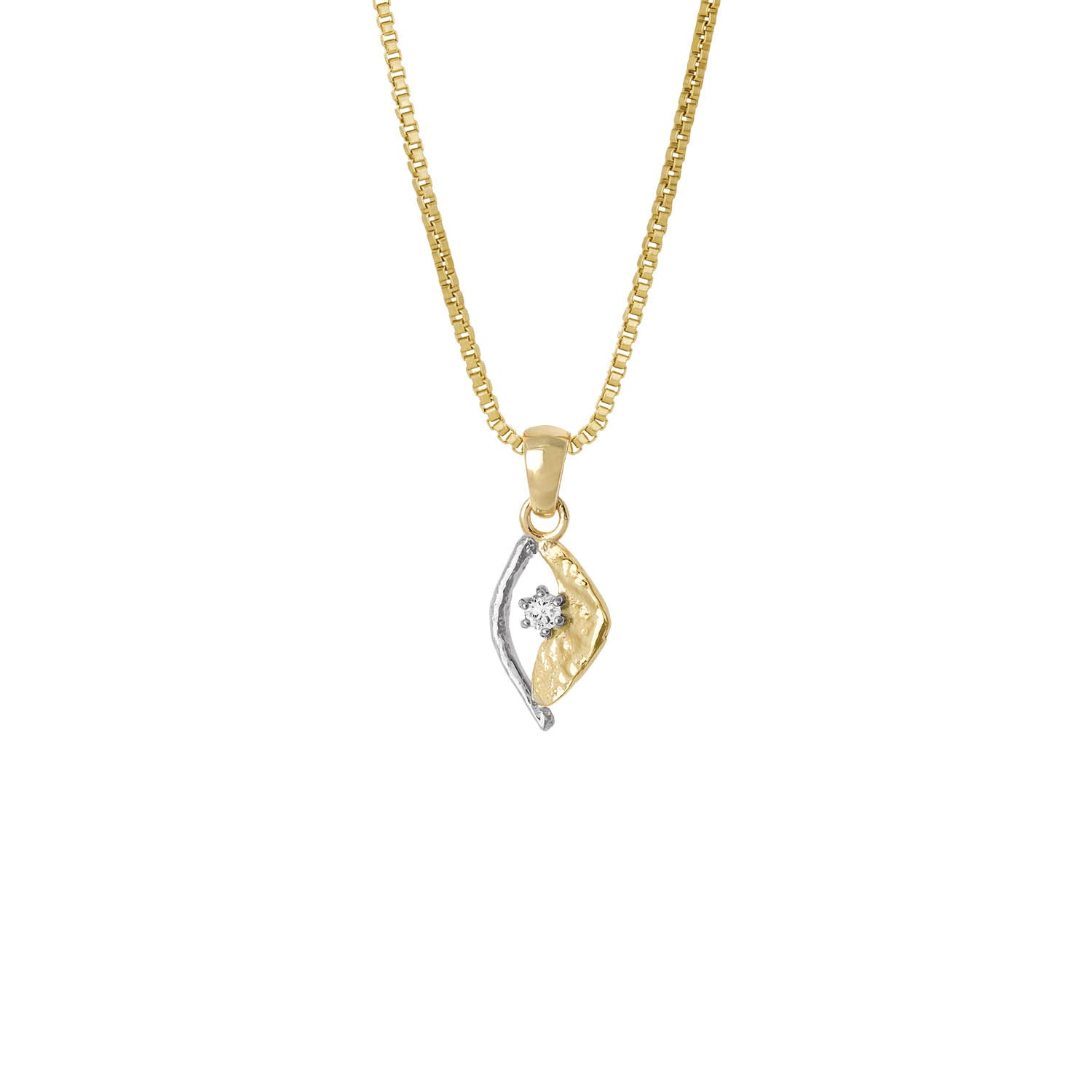 Hálsmenið er handsmíðað úr 14 karta gulli og hvítagulli með 3 punkta demanti í TW VS1 gæðum.  Þegar talað er um stærð (og þar með þyngd) demanta er ýmist notast við karöt eða punkta. 3 ... Sjá nánar