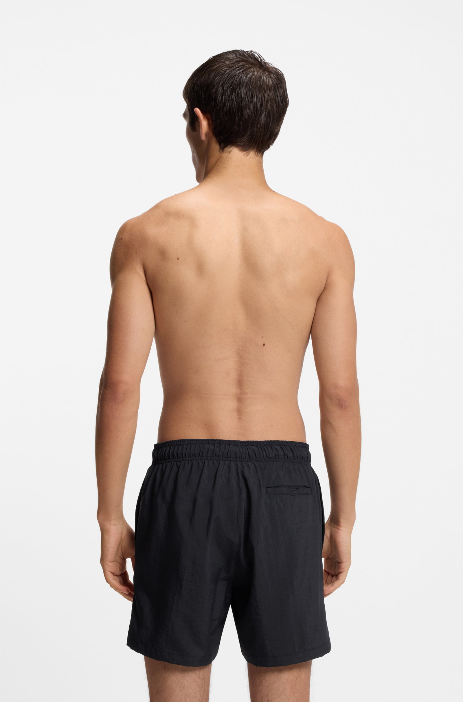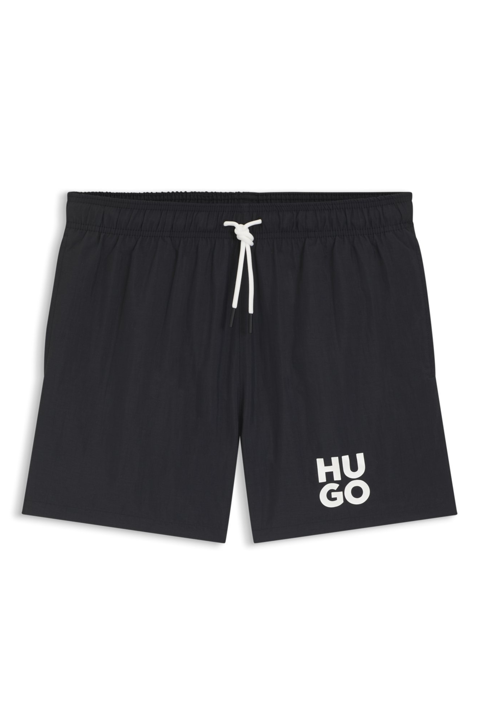 With a printed stacked logo and coordinating cord, these HUGO Menswear swim shorts are naturally quick to dry. Comfortable elasticized waist. Fixed waistband Pockets bottom front: Side pockets ... Sjá nánar