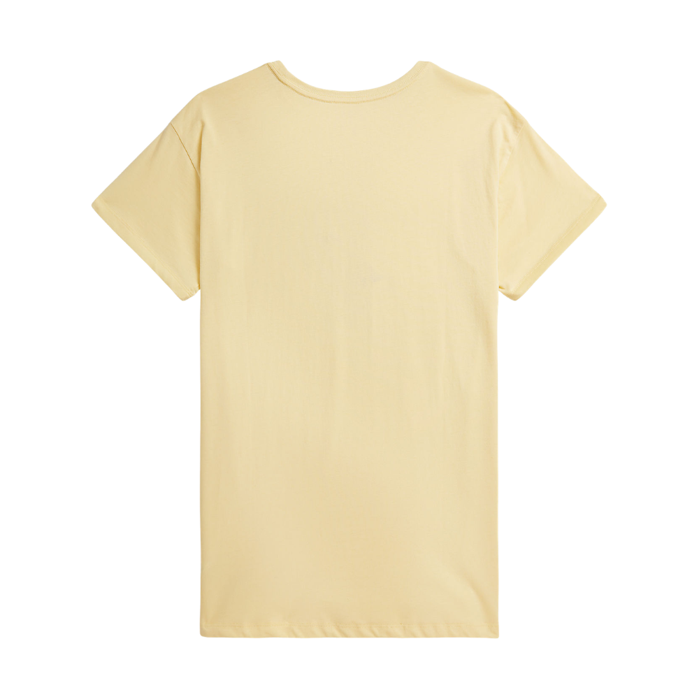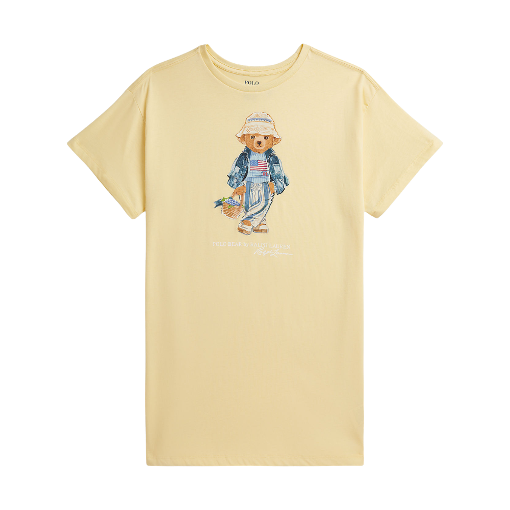 Ljós gulur kjóll frá Polo Ralph Lauren með stuttum ermum og sætri bangsa mynd að framan. 100% bómull.
