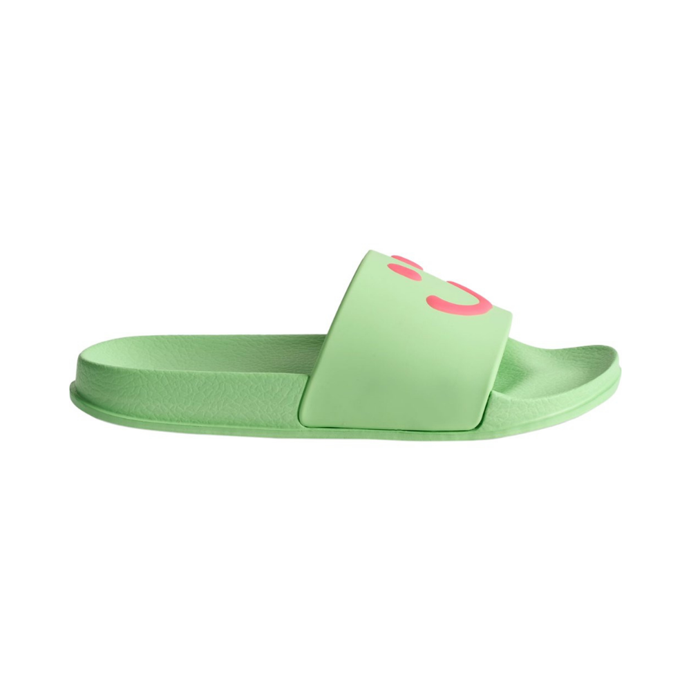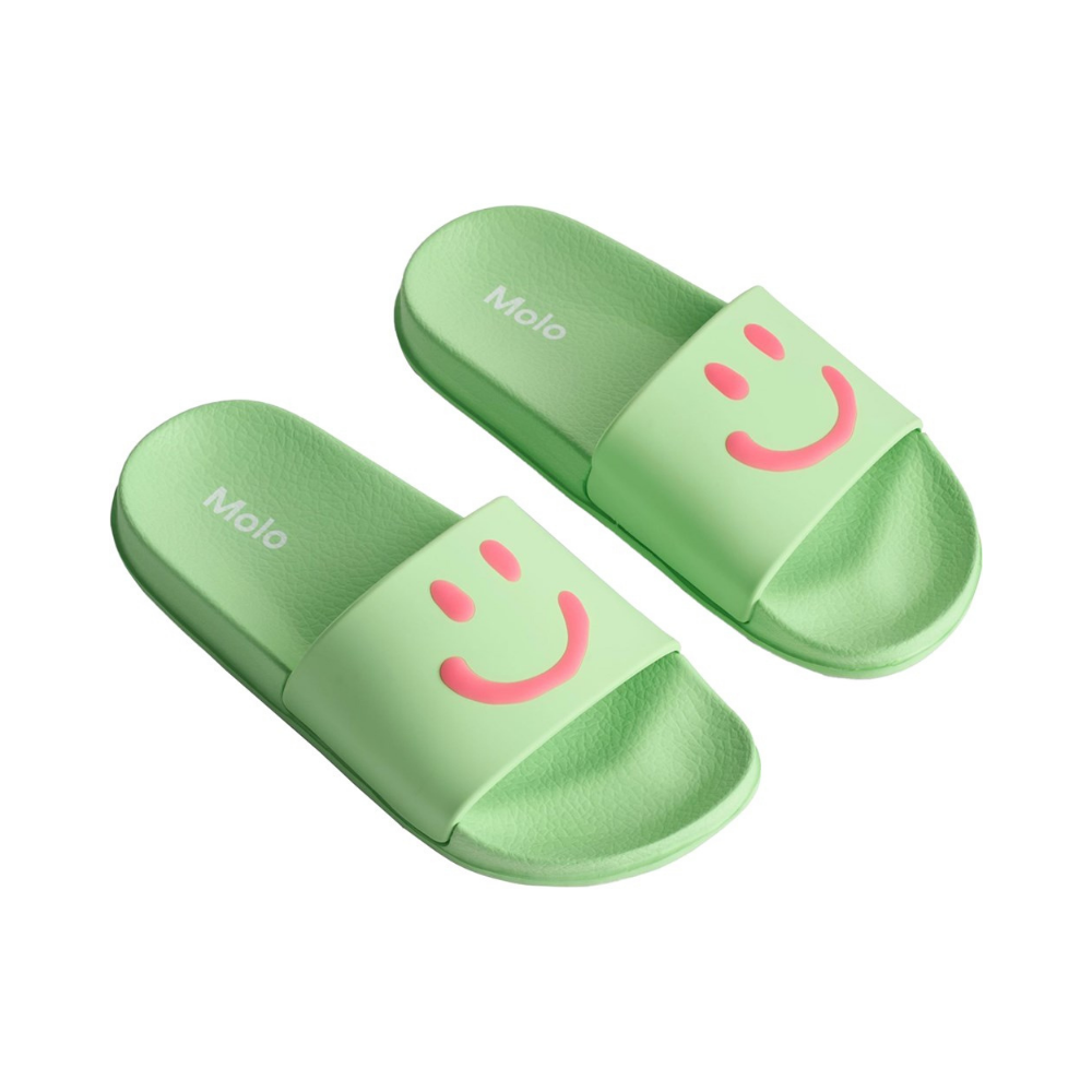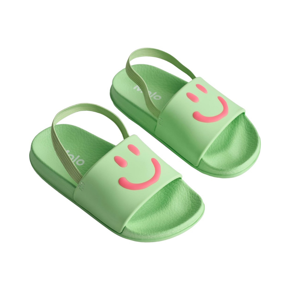 Grænir Molo sandalar með bleikum broskalli. Stærðir 23/24 og 25/26 eru með teygju við hæl. Sandalarnir eru vatnsheldir og því fullkomnir til að fara með í sundlaugina eða á ströndina.