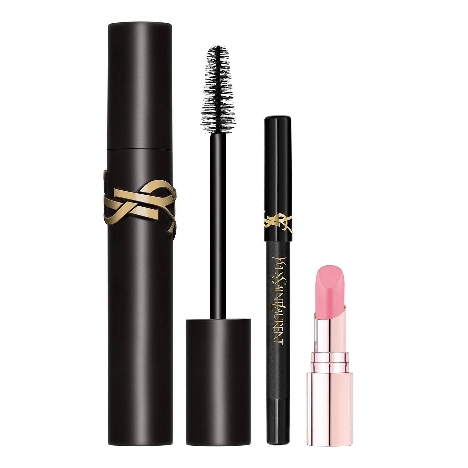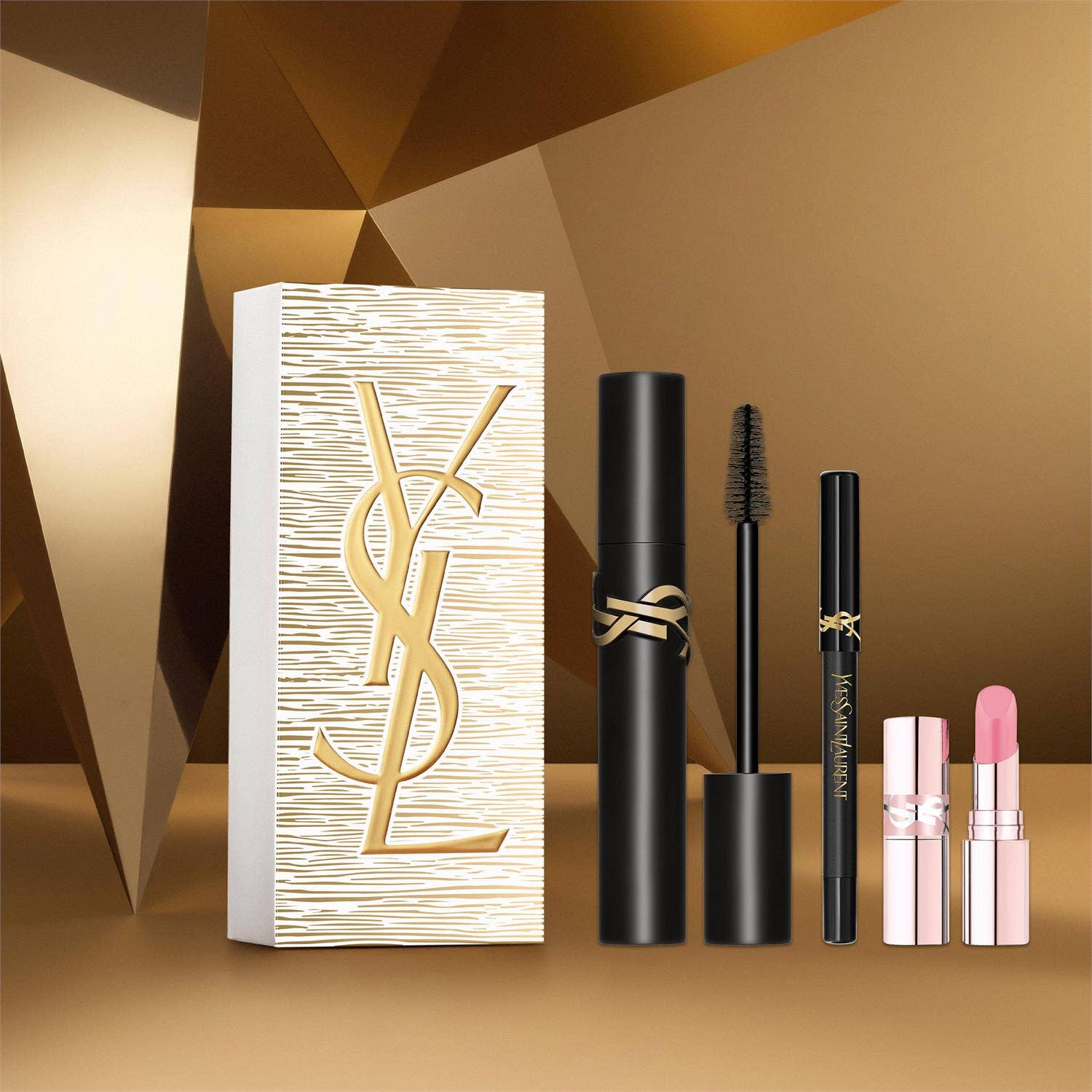 Lúxus hátíðargjafasett frá Yves Saint Laurent með maskara, eyeliner og rakagefandi varalit fyrir fullkomið hátíðarútlit.
