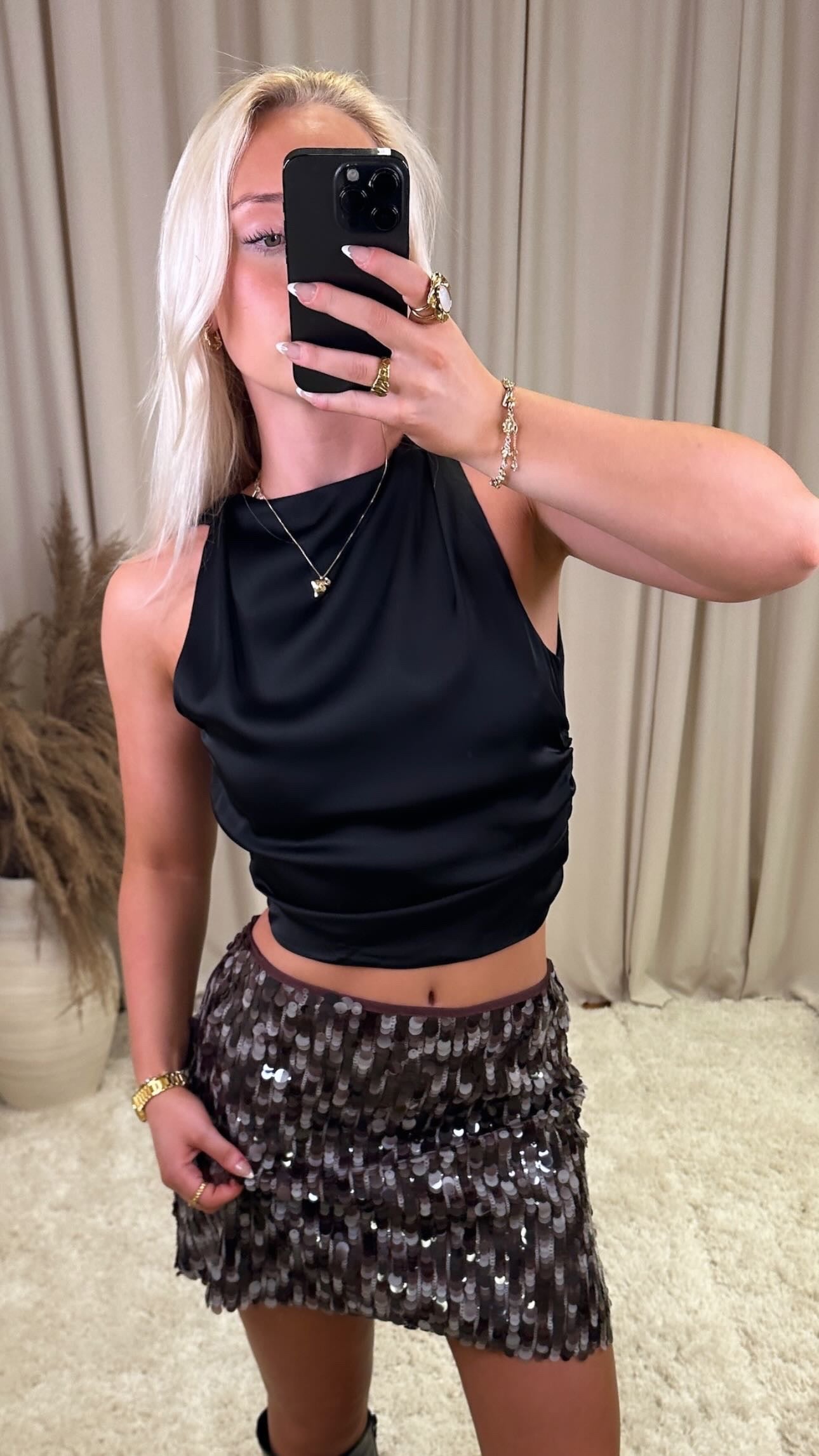 Æðislega flottur bolur úr mjög mjúku satín efni, það er engin teygja í efninu og er opin í bakið modelið er 160cm og er í stærð S