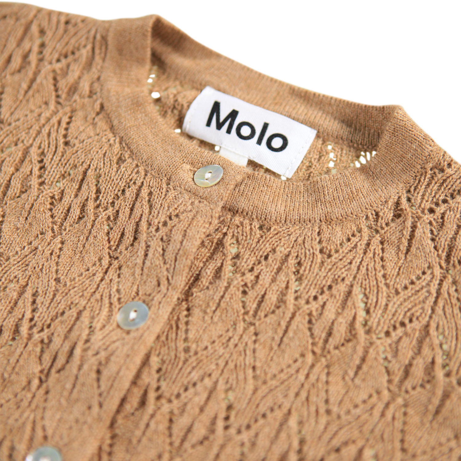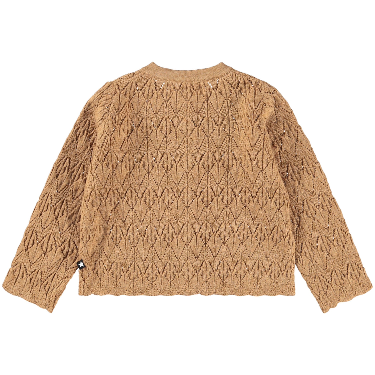 Brún, hneppt prjónapeysa með gatamynstri. 50% bómull og 50% ull.