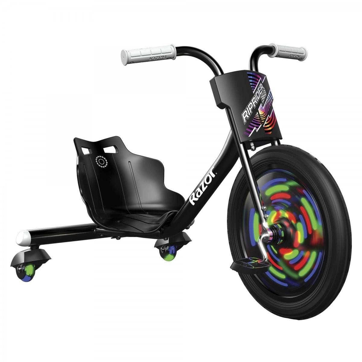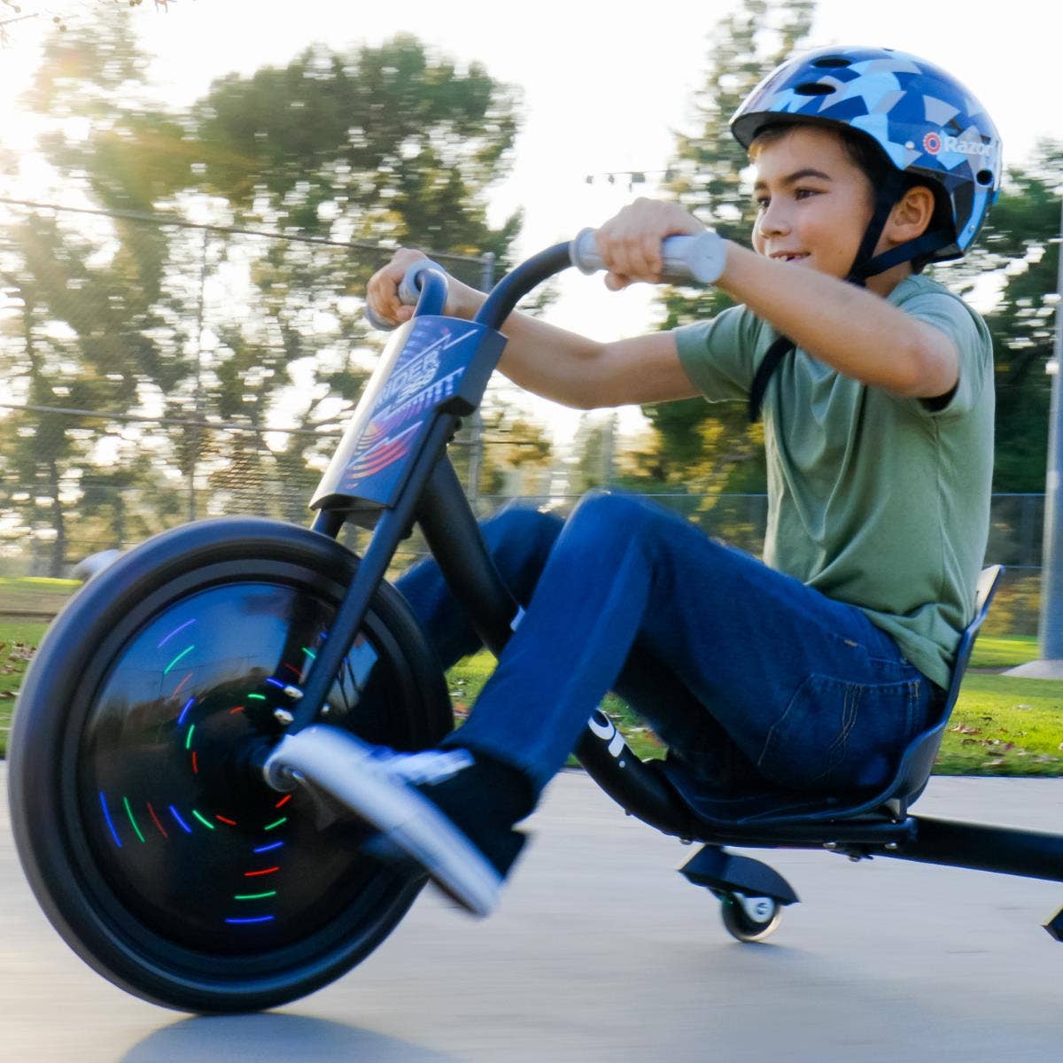 Stórskemmtilegt þríhjól með stóru framhjóli með ljósum.