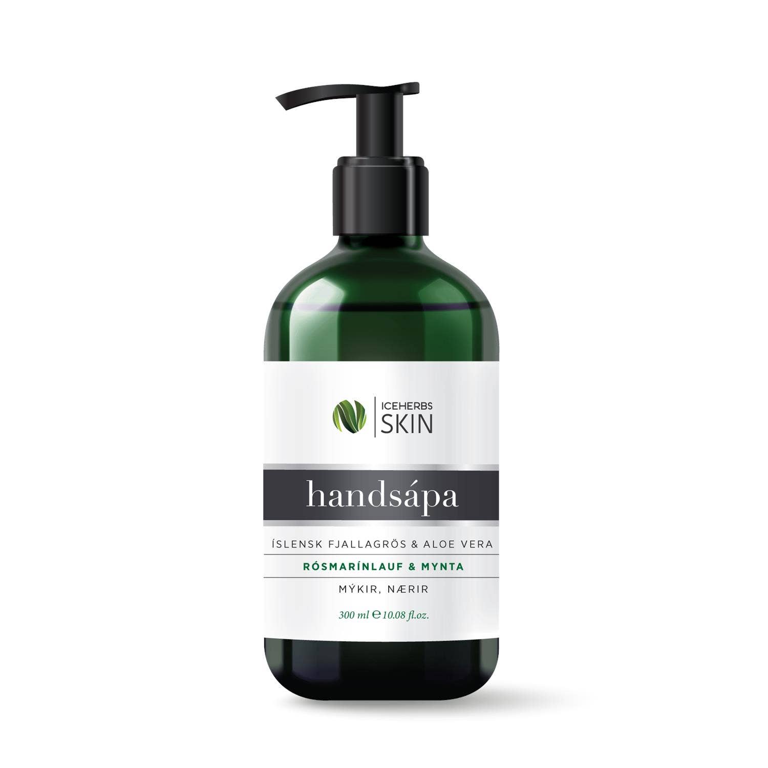 Nærandi handsápa með íslenskum fjallagrösum og Aloe Vera. Ilmar af rósmarínlaufum og myntu.