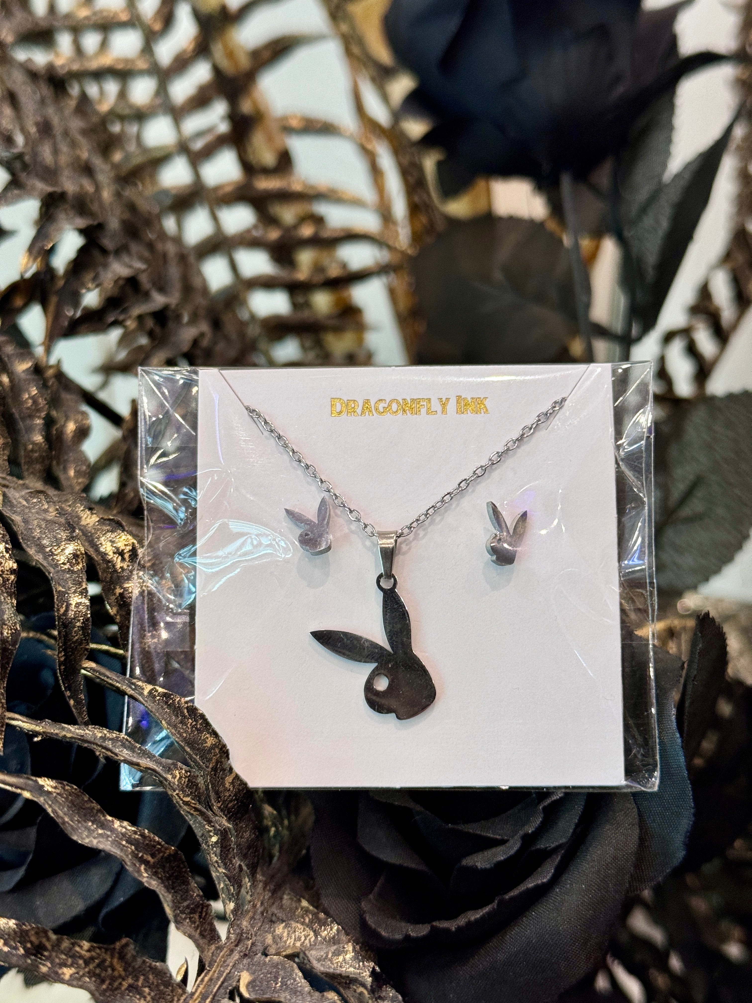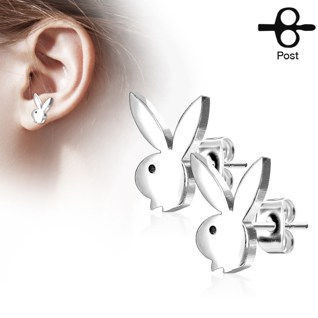 Playboy kanínu eyrnalokkar og hálsmen. Gert úr 316L Surgical Steel. Pinninn er 0.8mm þykkur.  A.T.H. Lokkarnir seljast í setti með hálsmeni.