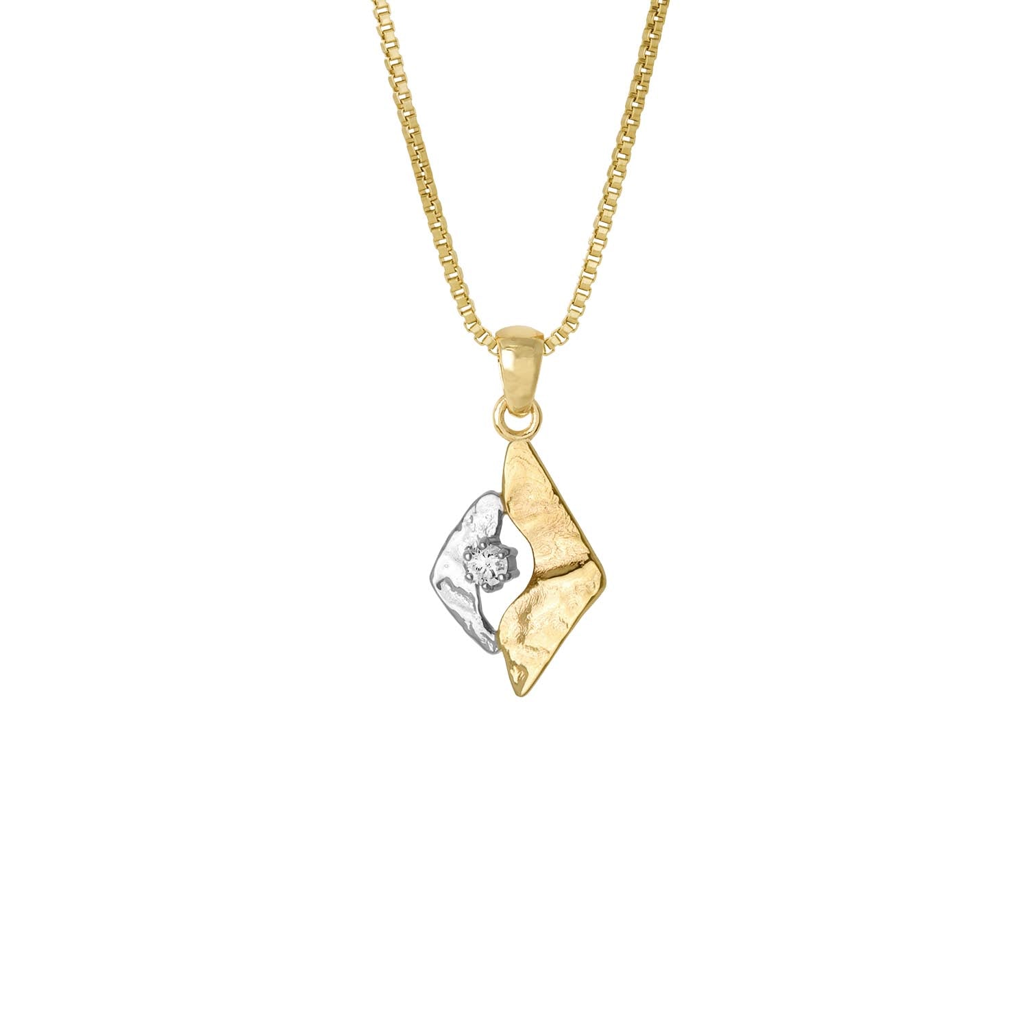 Hálsmenið er handsmíðað úr 14 karta gulli og hvítagulli með 5 punkta demanti í TW VS1 gæðum.  Þegar talað er um stærð (og þar með þyngd) demanta er ýmist notast við karöt eða punkta. 5 ... Sjá nánar