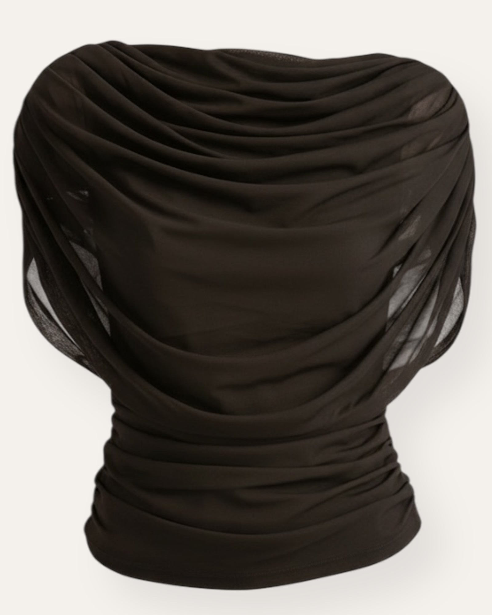 Chic drape toppur Elegant og töff bolur sem lyftir hvaða outfit sem er. Fallega draperað efni sem leggst mjúklega yfir axlirnar og skapar classy en samt sexy look. Fullkominn með gallabuxum ... Sjá nánar