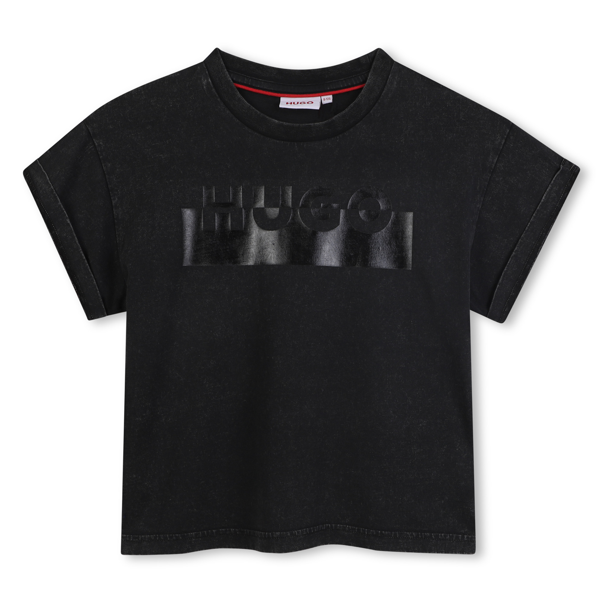 Svartur stuttermabolur frá Hugo með stóru logo að framan. 100% bómull.