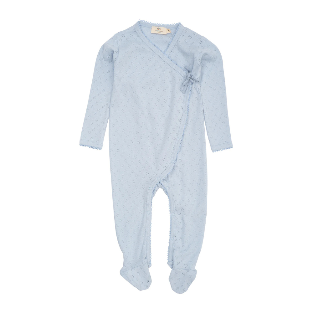 Ljós blár heilgalli frá Copenhagen Colors með smáu gatamynstri og áföstum sokkum . Gallinn er bæði smelltur og bundinn að framan. 100% bómull.
