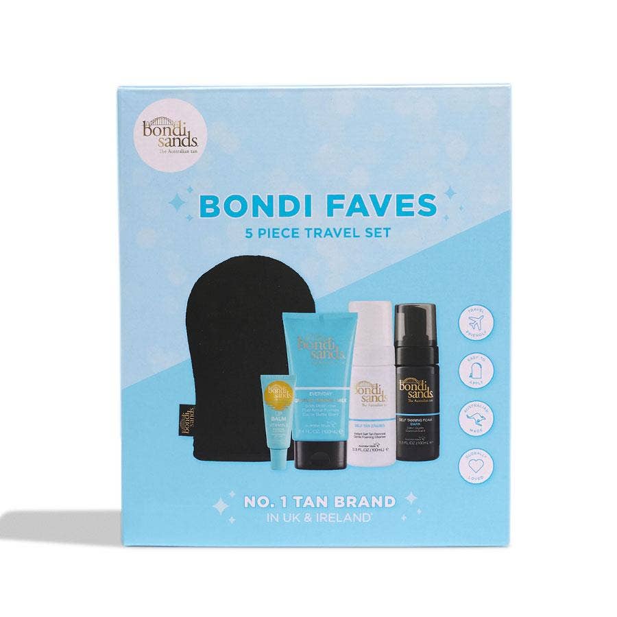 Bondi Faves 5 Piece Travel Set er handhægt ferðasett með 5 frábærum vörum sem hjálpa þér að fá fallega sólkyssta brúnku allan ársins hring, ásamt nærandi varasalva með kókosilm