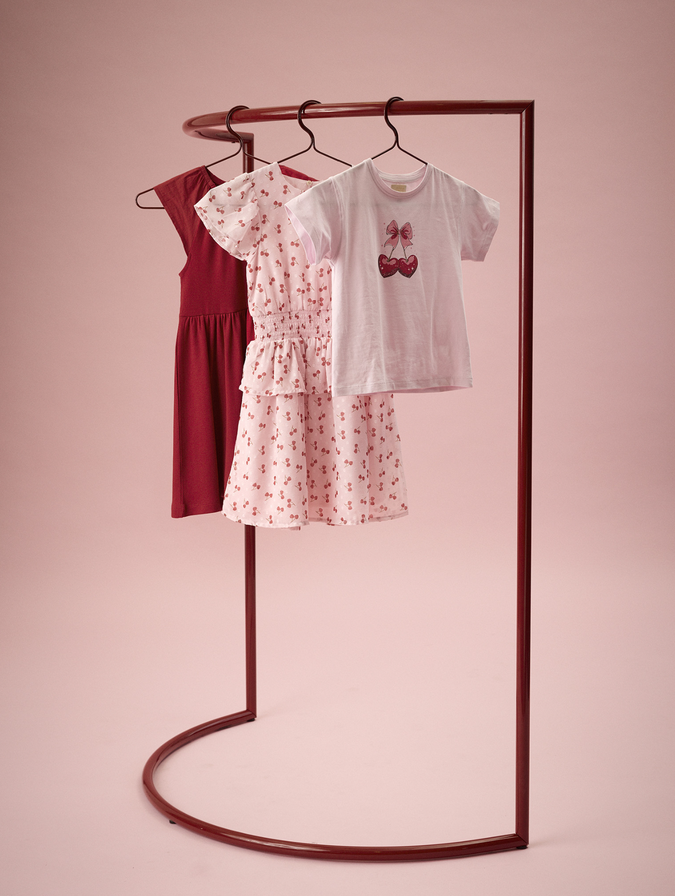 Bleikur kjóll frá Creamie með sætu kirsuberjamynstri. 100% polyester.