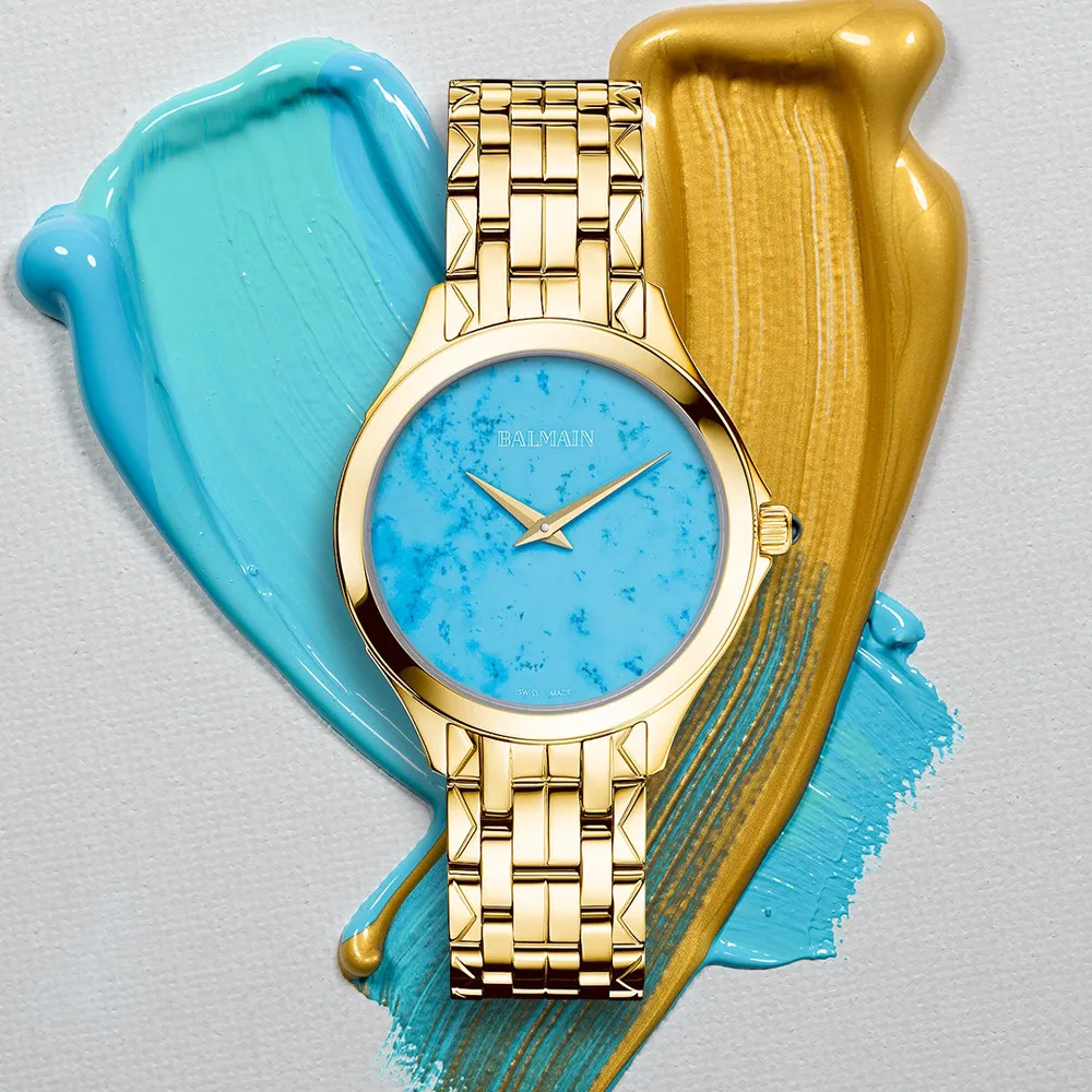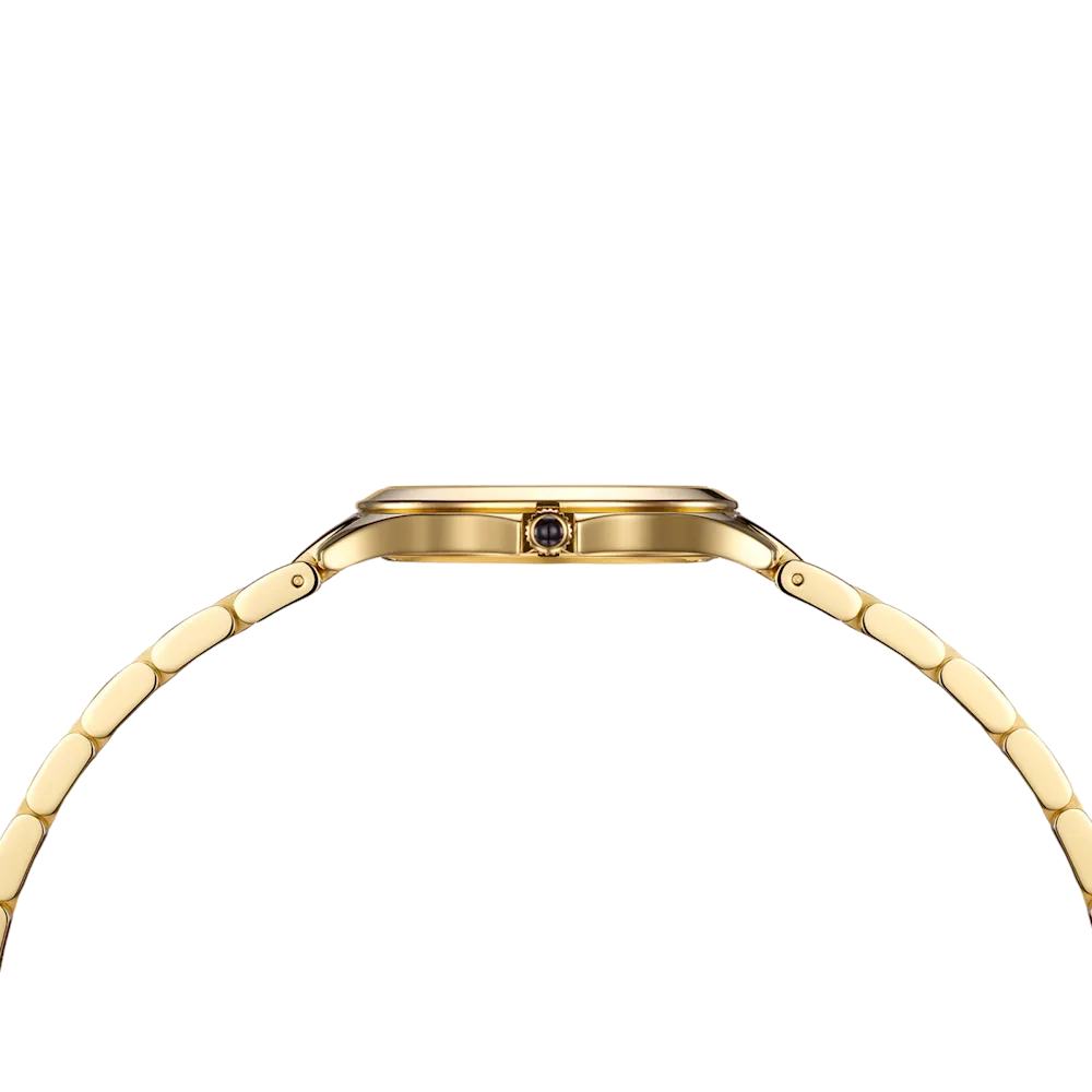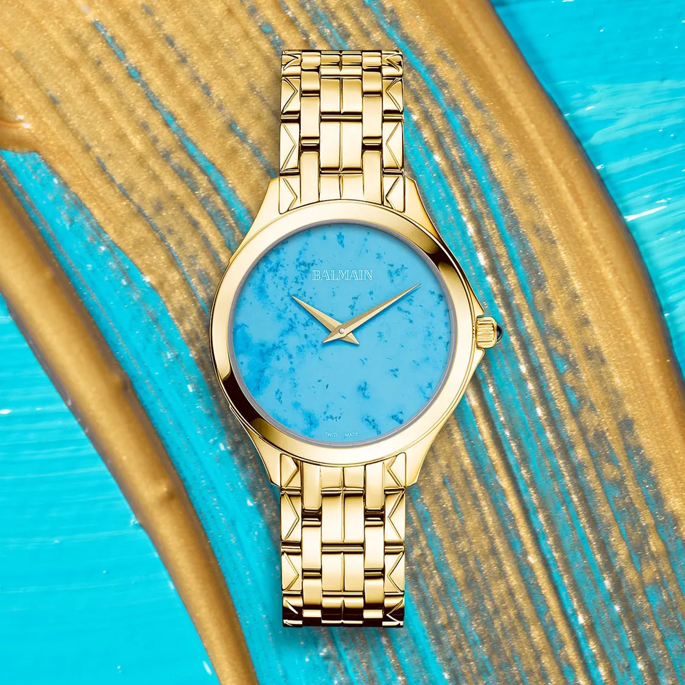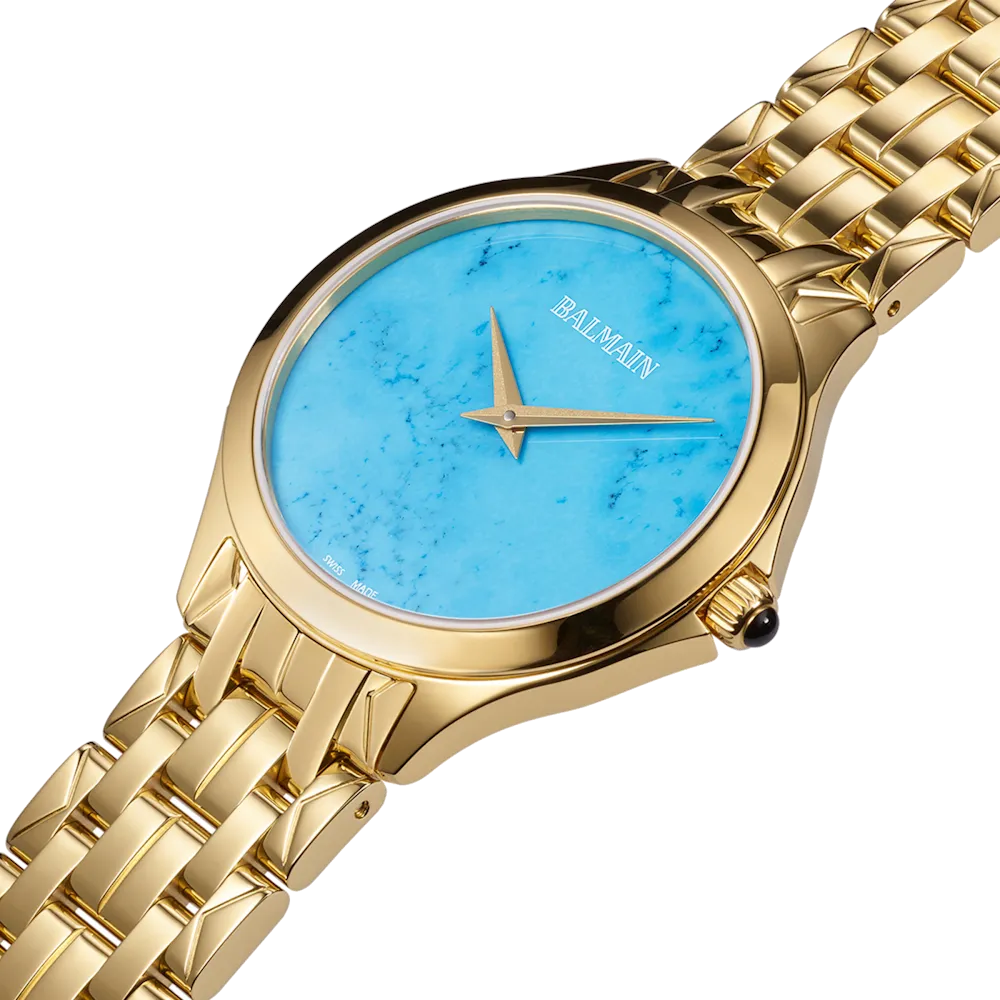 Úrkassi: 34mm – gyllt stál Úrverk: Rafhlaða – svissneskt Vatnsvörn: 50M Skífa: Náttúrulegt túrkís – vísar Gler: Safírgler – speglunarvörn Keðja: Gyllt stál – öryggislás Ábyrgð: Tveggja ára