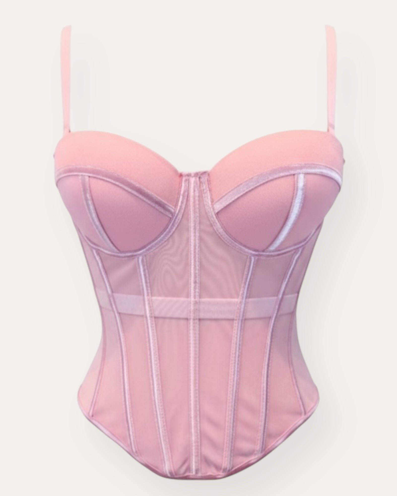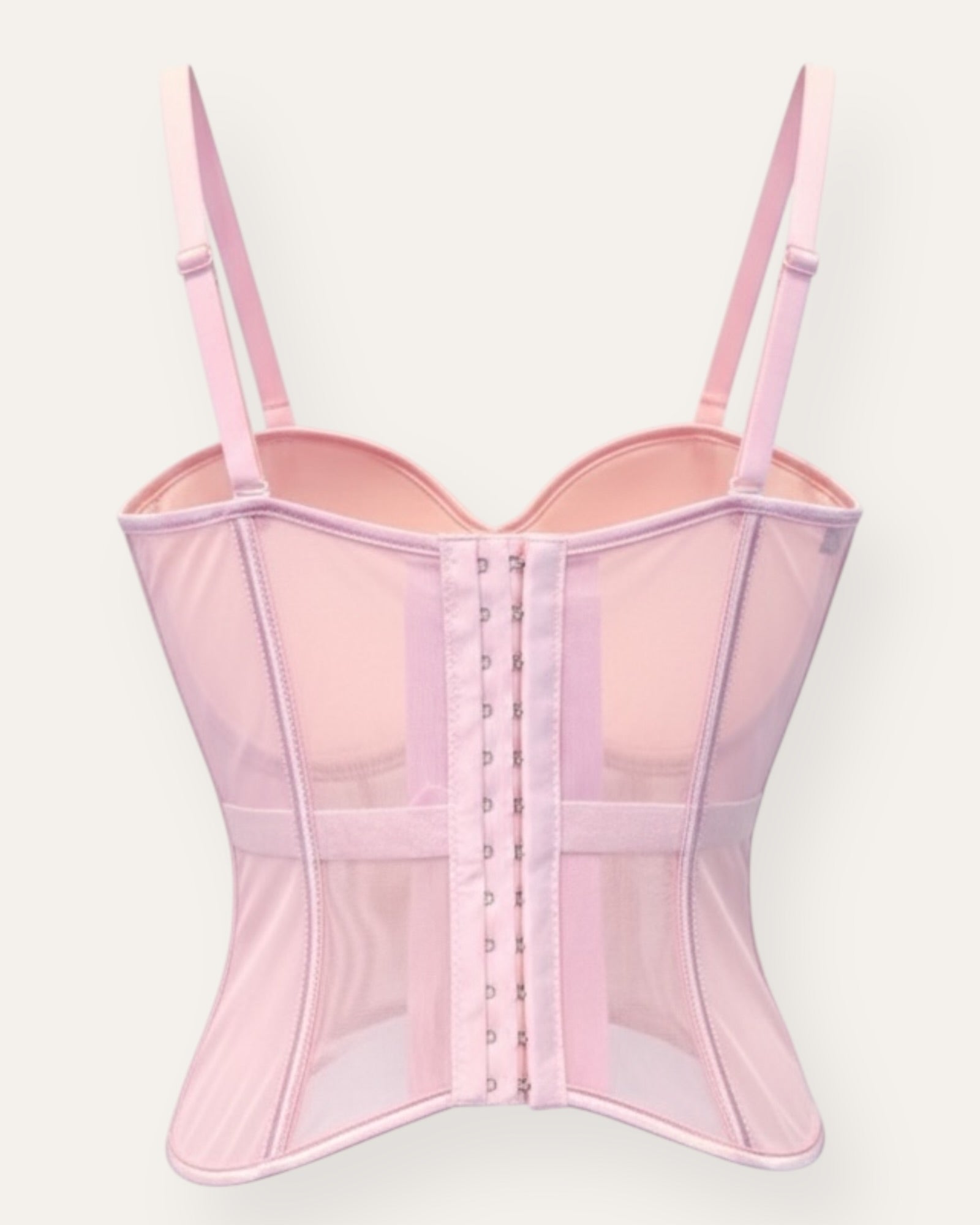 Mesh Corset með Satin Detail Glæsilegt og kvenlegt corset sem mótar fallega silhúettu. Corsetið er úr léttu og gegnsæju mesh efni með fallegum satin detailum sem gefa því elegant og fágað útlit. Sjá nánar