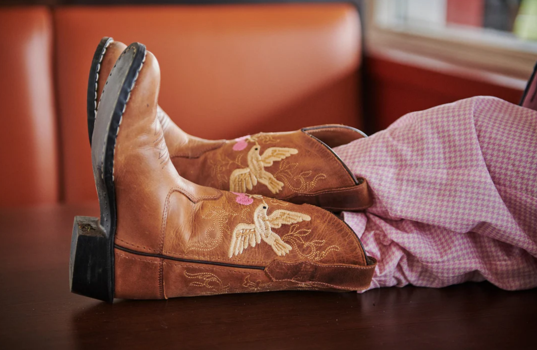 Ljós brún, leður stígvél með útsaumuðu mynstri. Leðursóli með endingargóðum hæl 100% leður.