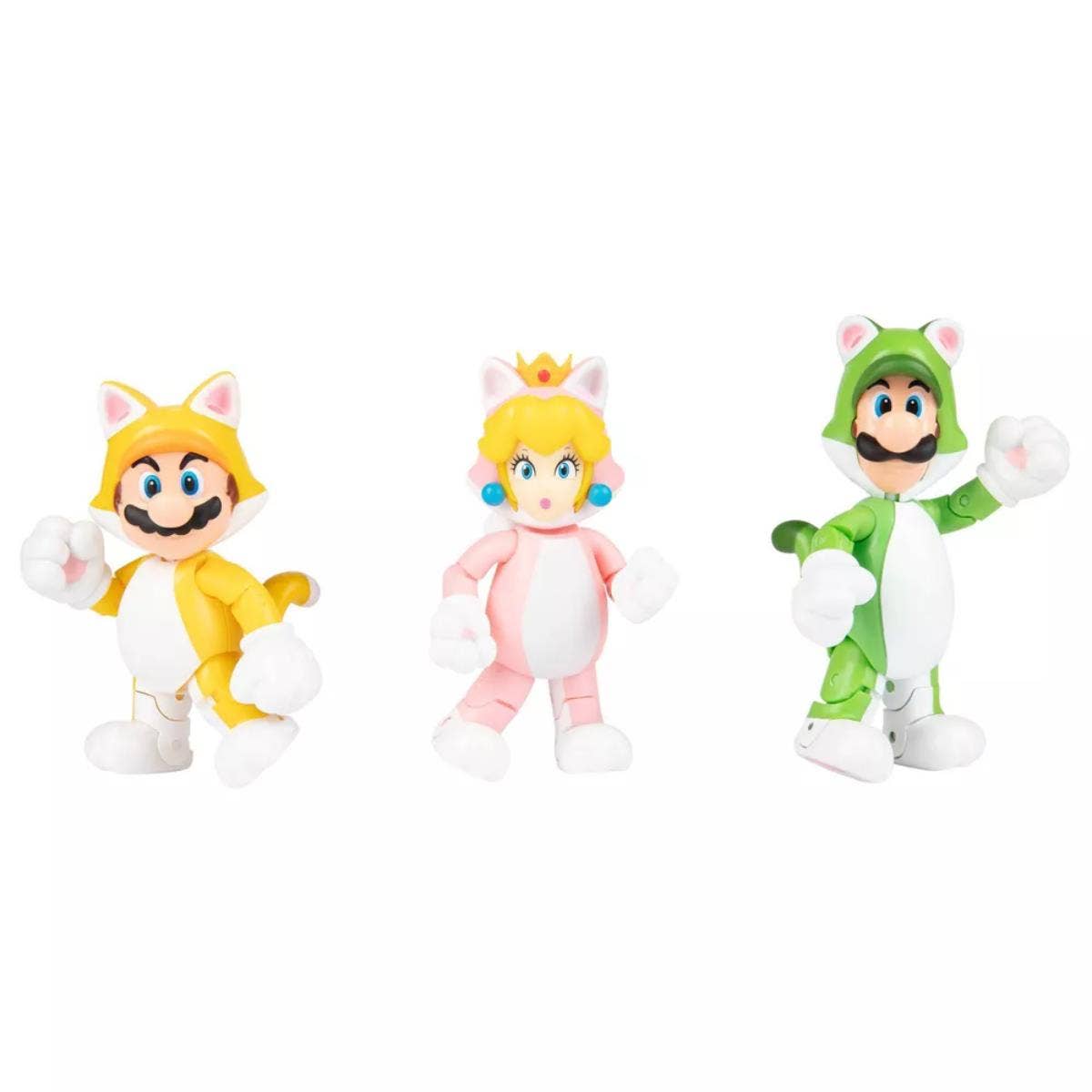 Skemmtilegt sett með þremur fígúrum úr Super Mario heiminum klæddar í dýrabúning.
