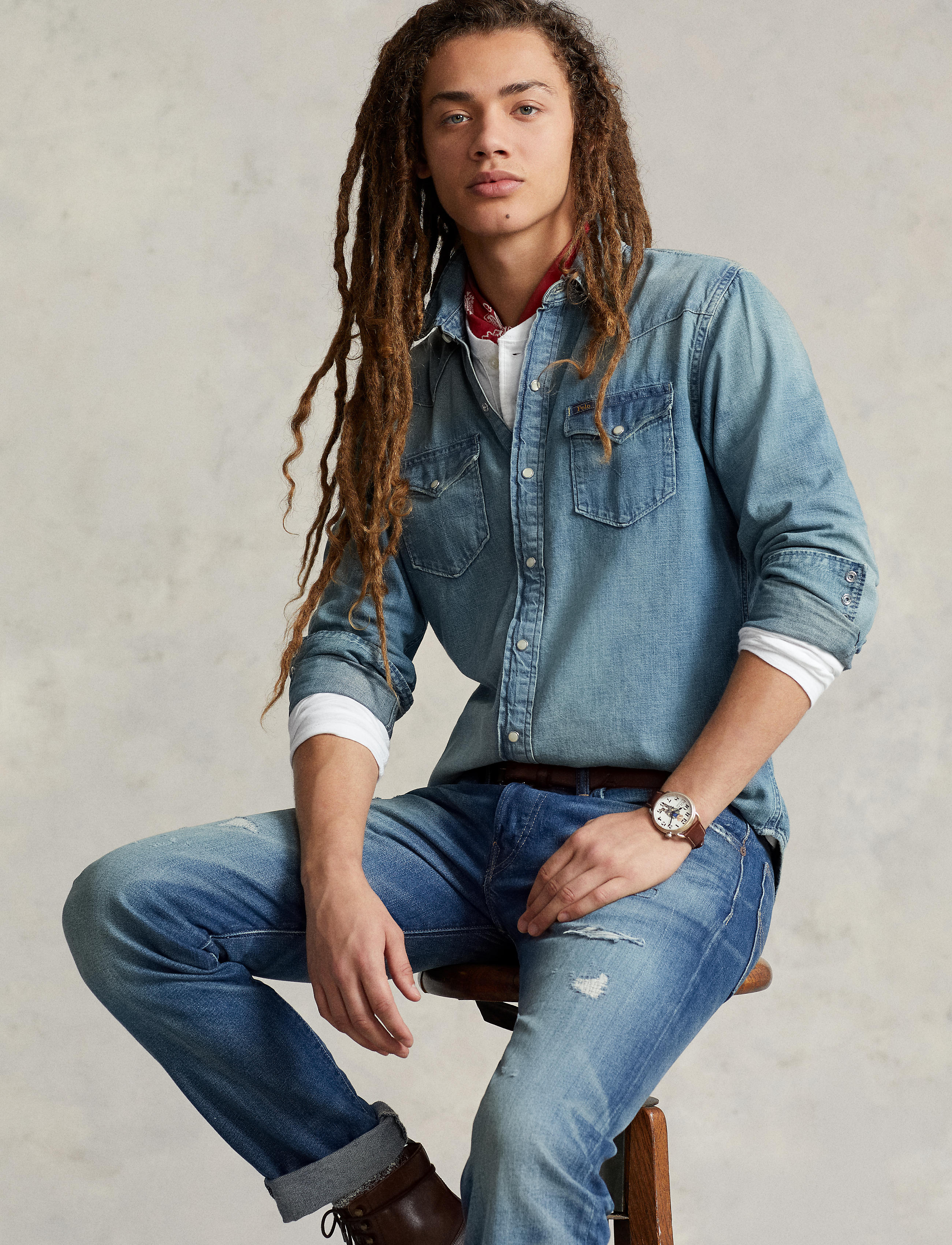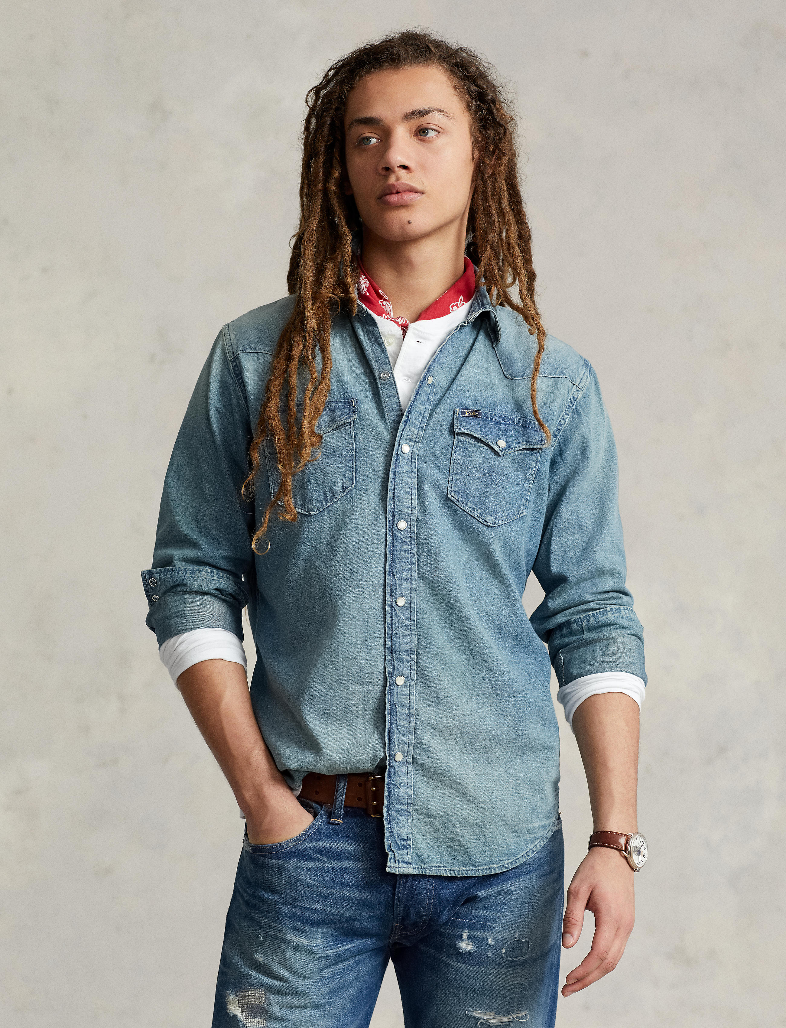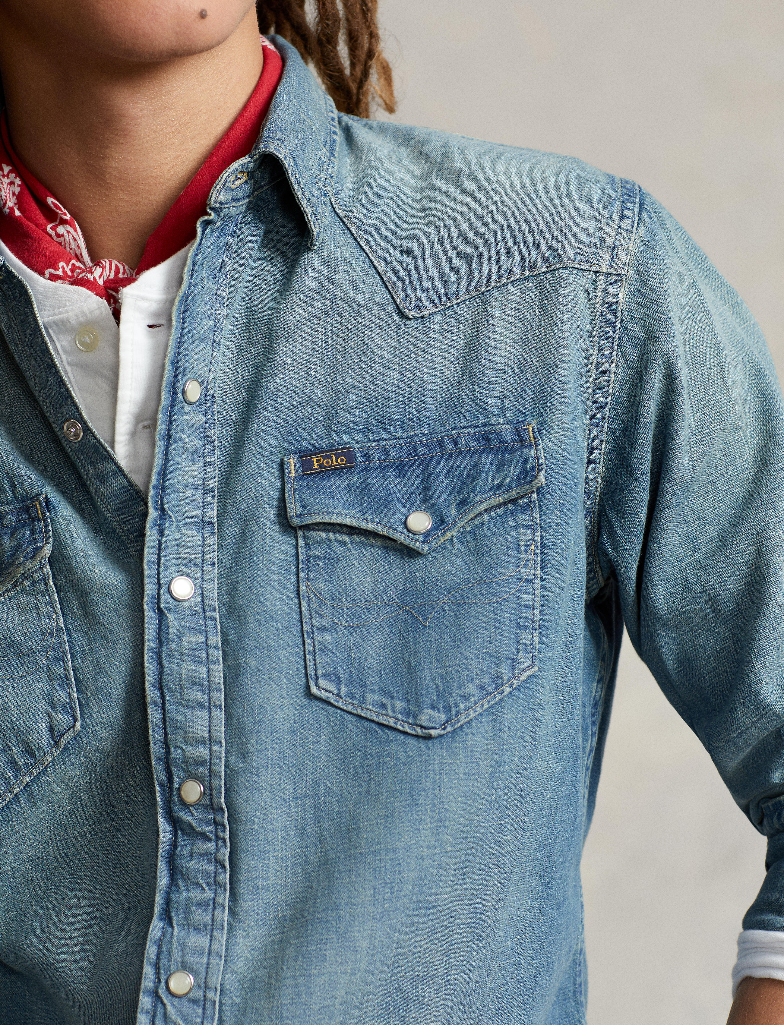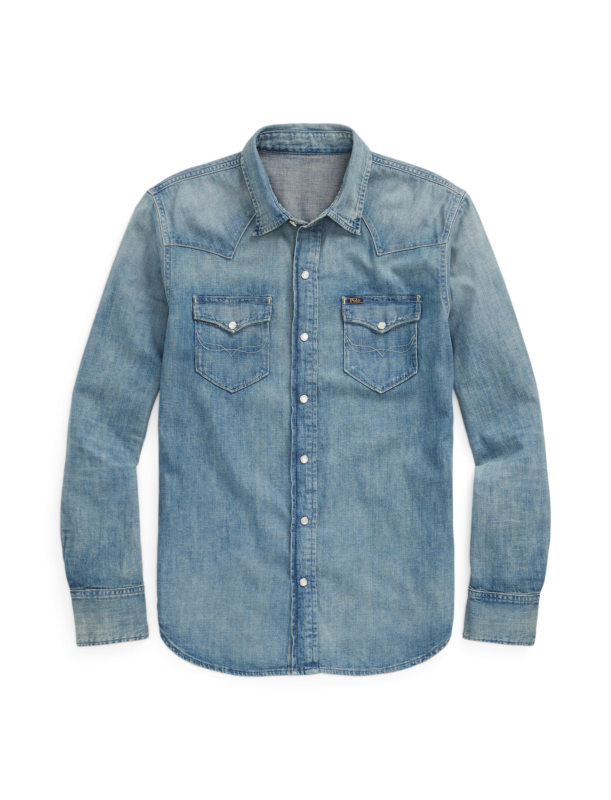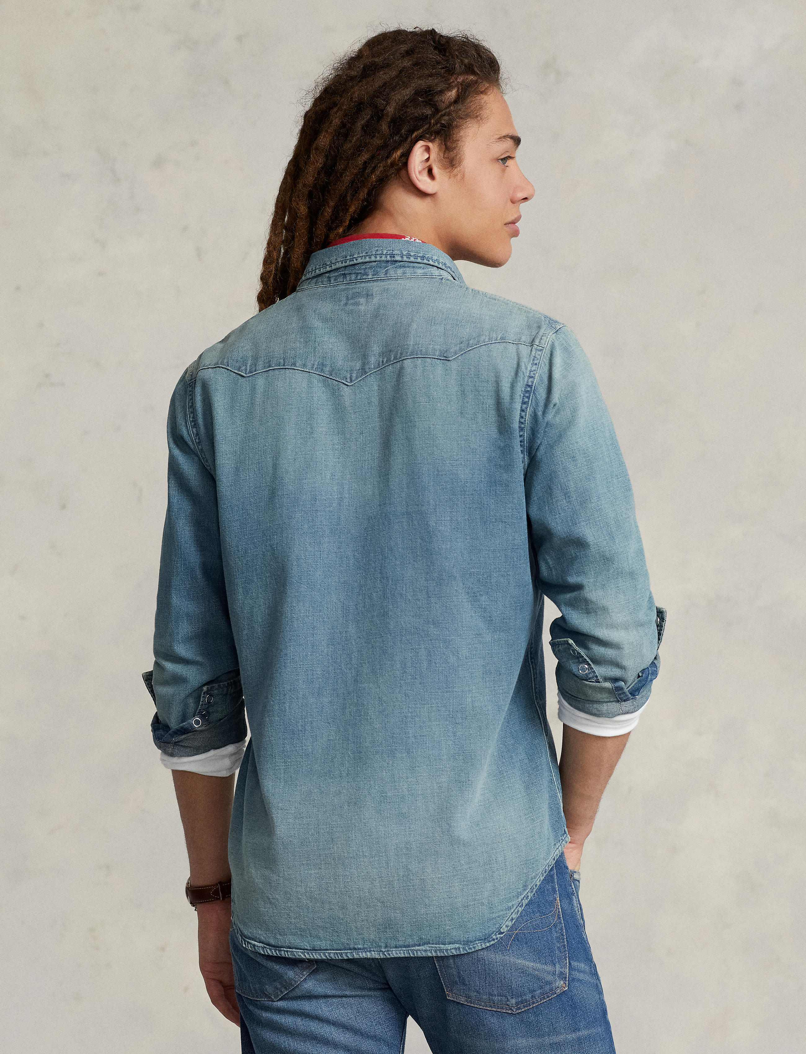 This version of our iconic Western shirt is generously cut from lightweight slub denim and treated for a weathered look. Size medium has a 29¼" body length, an 18¼" shoulder, a 44" chest, and ... Sjá nánar
