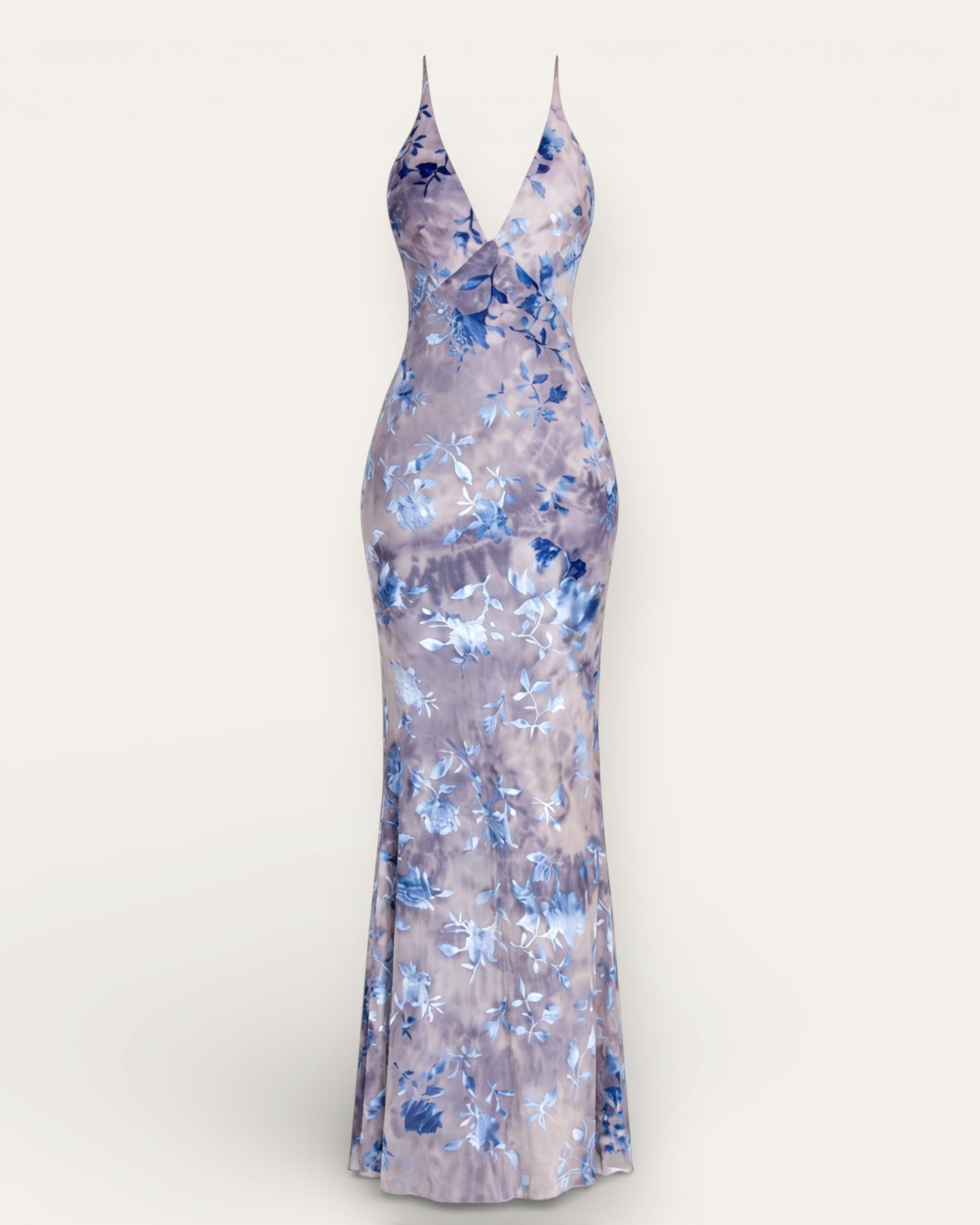 Dusty Blue floral slip maxi kjóll Fallegur og kvenlegur slip maxi kjóll í mjúkum dusty blue tónum með bláu blómamynstri. Djúpt v-hálsmál og aðsniðið snið sem fellur elegant niður líkamann og ... Sjá nánar