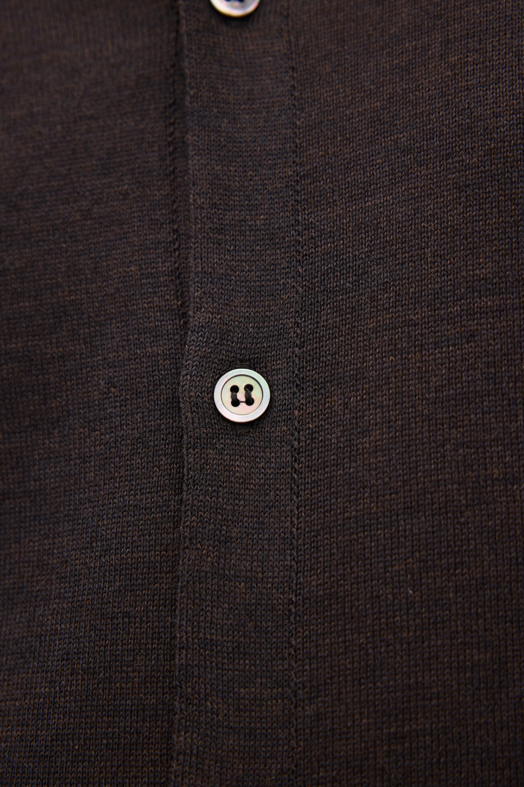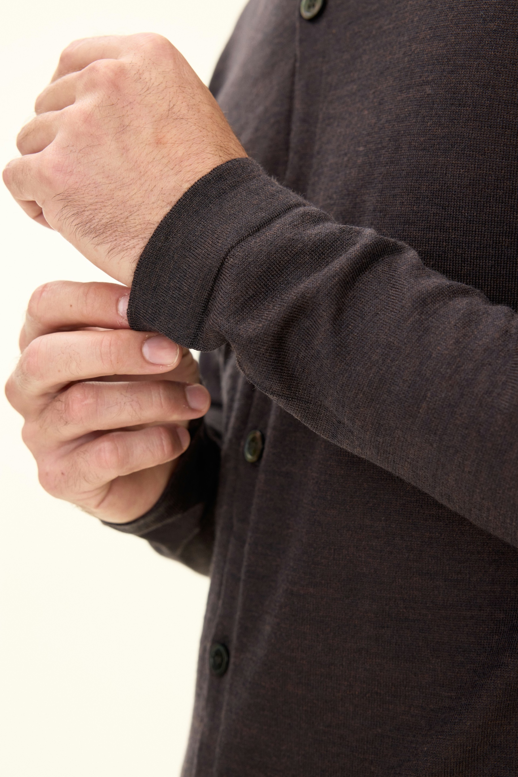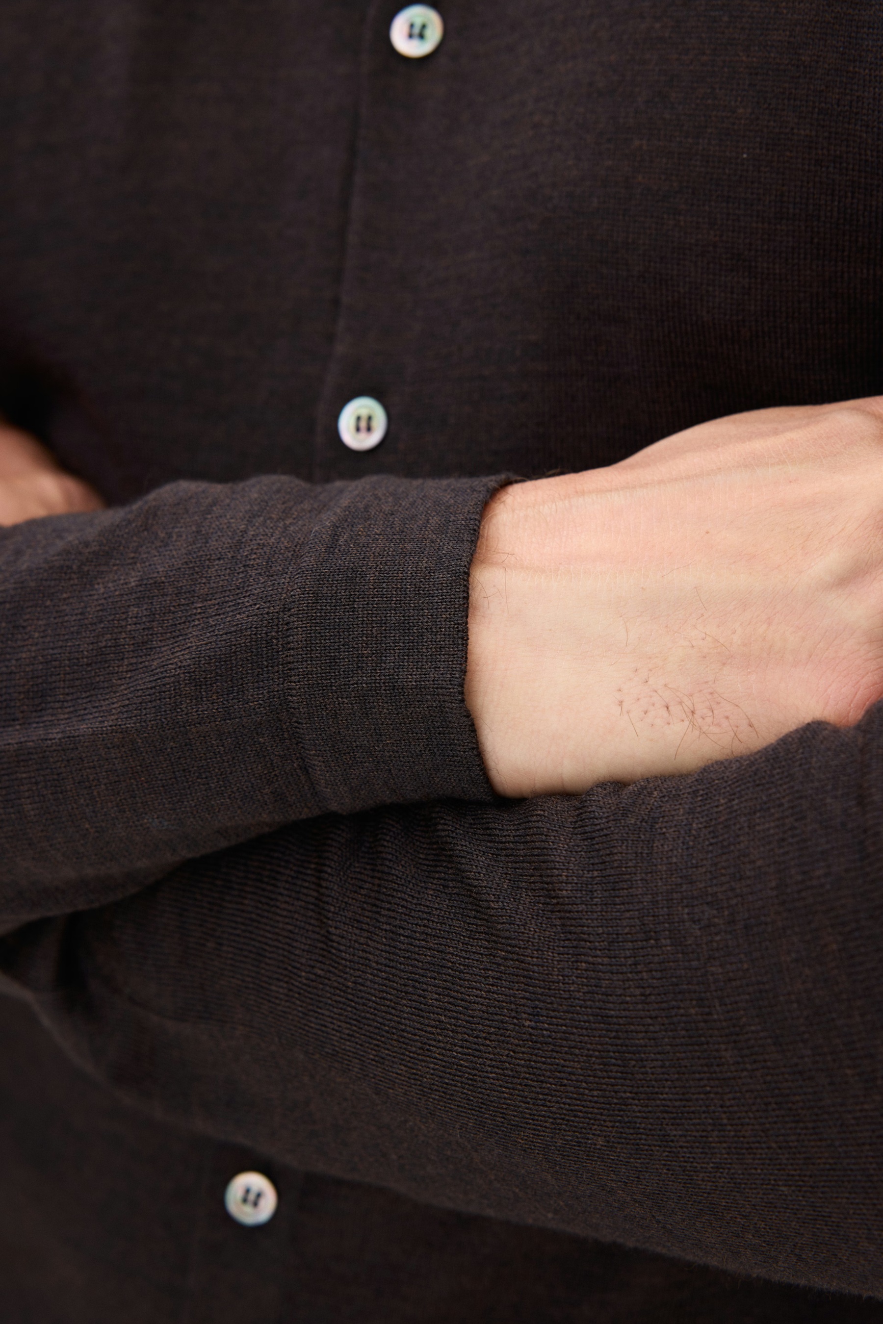 Cardigan in extra fine merino wool from Tollegno, Italy. Knitted in 14 gauge. The wool fibres are long, giving the garment a luxurious and slightly shiny surface. Sewn-on collar in a classic ... Sjá nánar