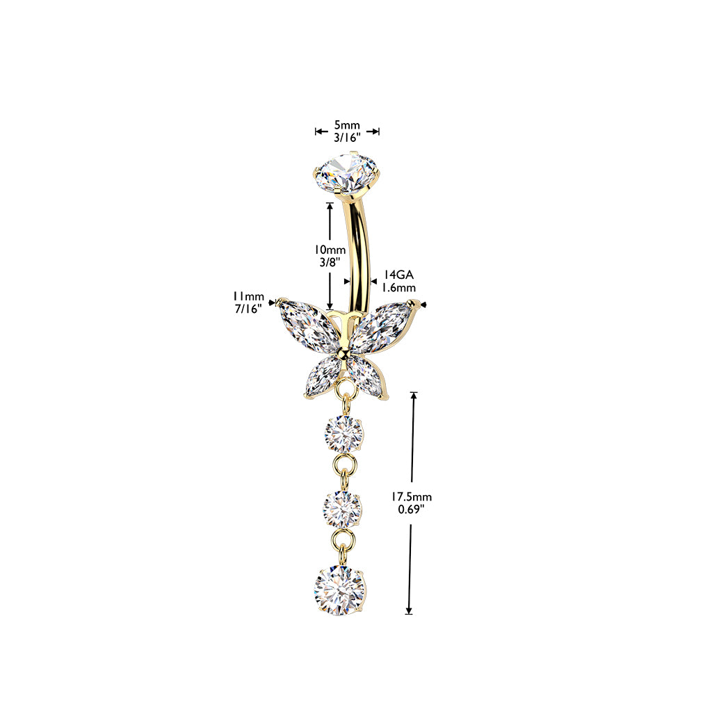 Titanium naflalokkur með Fiðrildi og hangandi steinum Lokkurinn er gerður úr ASTM F136 implant-grade titanium. Tested for utmost safety and ease of use in professional body piercing applications.