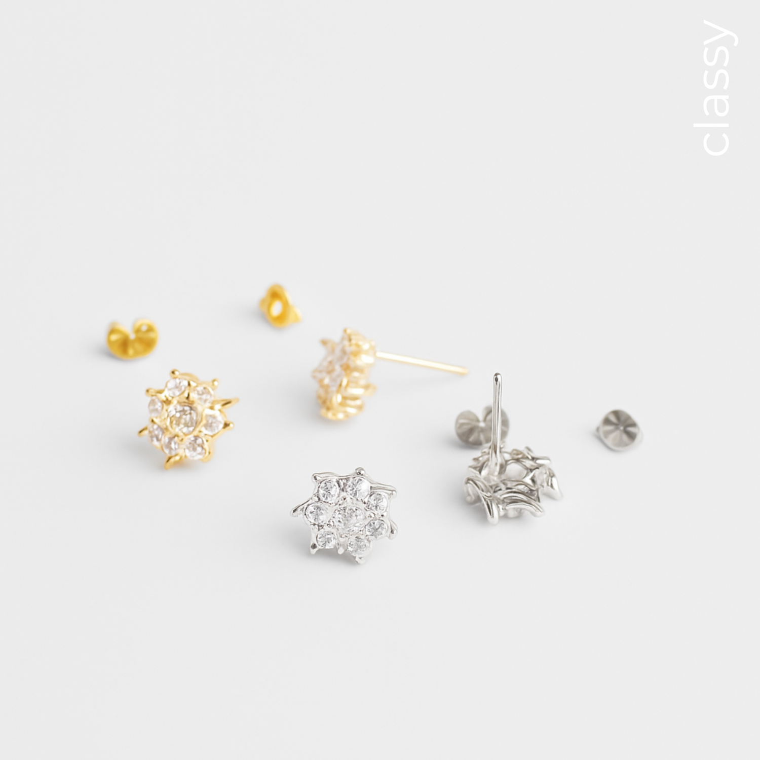Ryðfrítt stál og brass með rhodium og 14kt gullhúð. Cubic Zirconia steinar.   English: Stainless steel/brass Rhodium & 14kt gold plated. Cubic Zirconia stones.