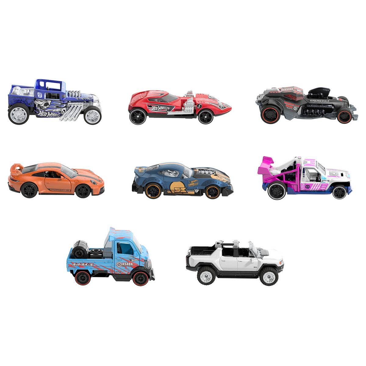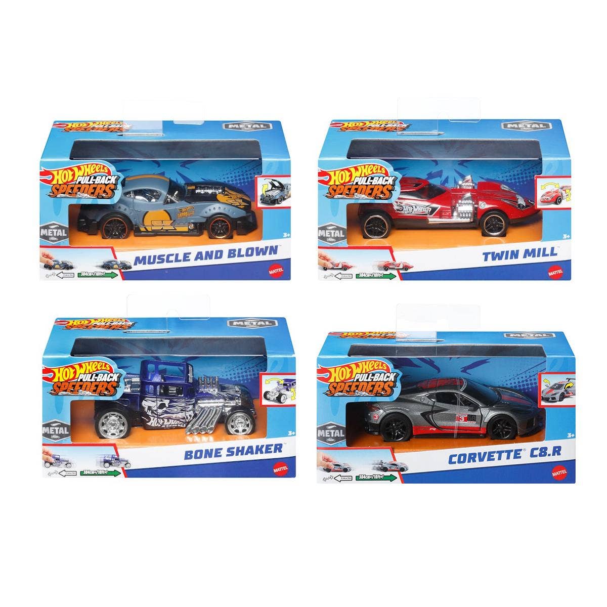 Vandaður smábíll frá Hot Wheels sem þú trekkir upp með því að draga aftur á bak.