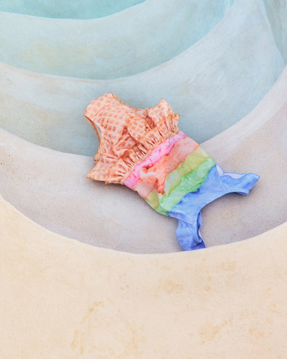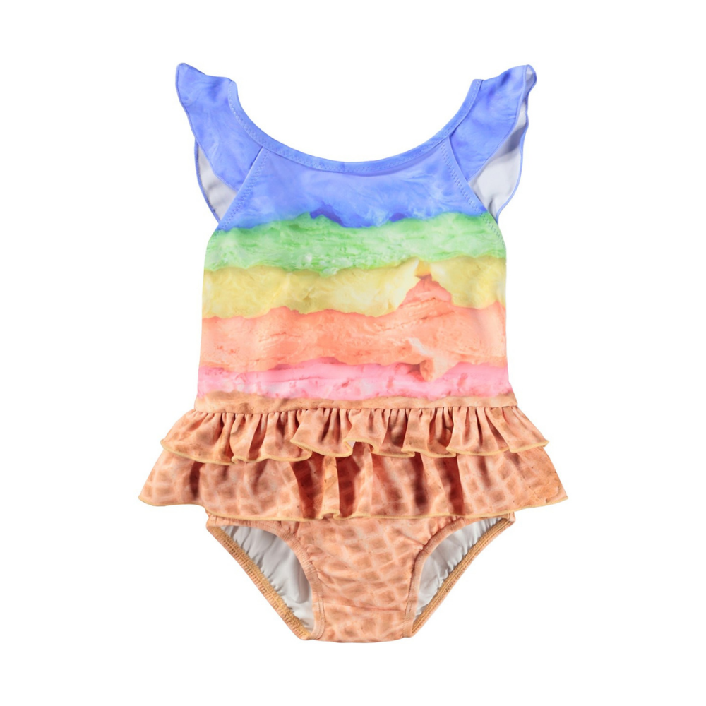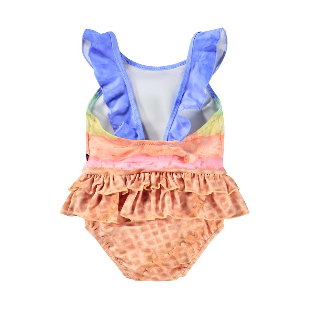 Fallegur sundbolur frá Molo. Pífu hlýrar og pífa yfir mittið gerir hann extra sætan. Gott pláss fyror sundbleiu. UV50+ sólarvörn gegn geilsum sólarinnar. 80% polyester og 20% elastane.