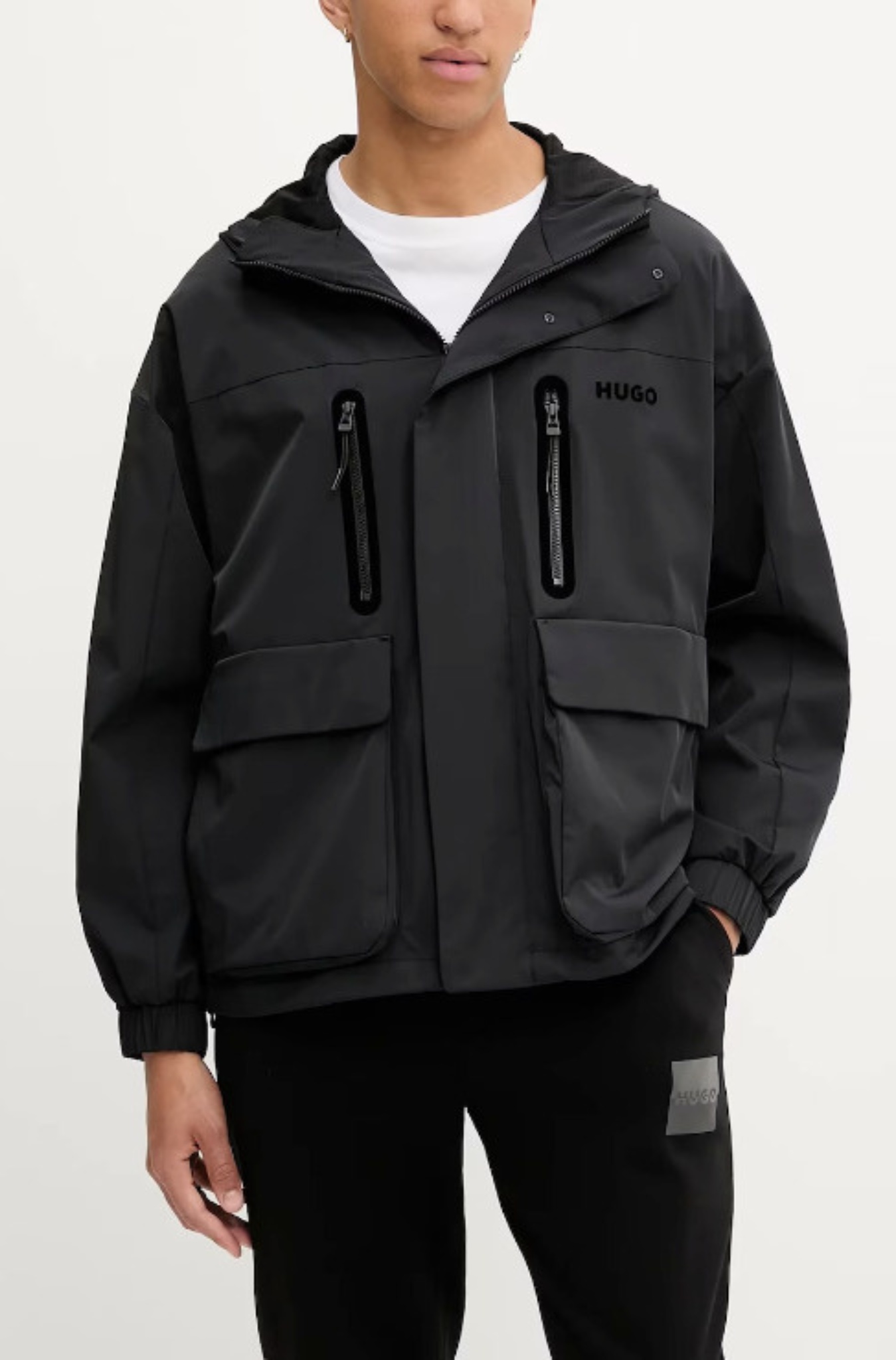 Cut to a straight fit with an adjustable hem, this water-repellent HUGO Menswear jacket is essential during the changing seasons. Tonal logo print. 90% Polyamide (recycled), 10% Elastane
