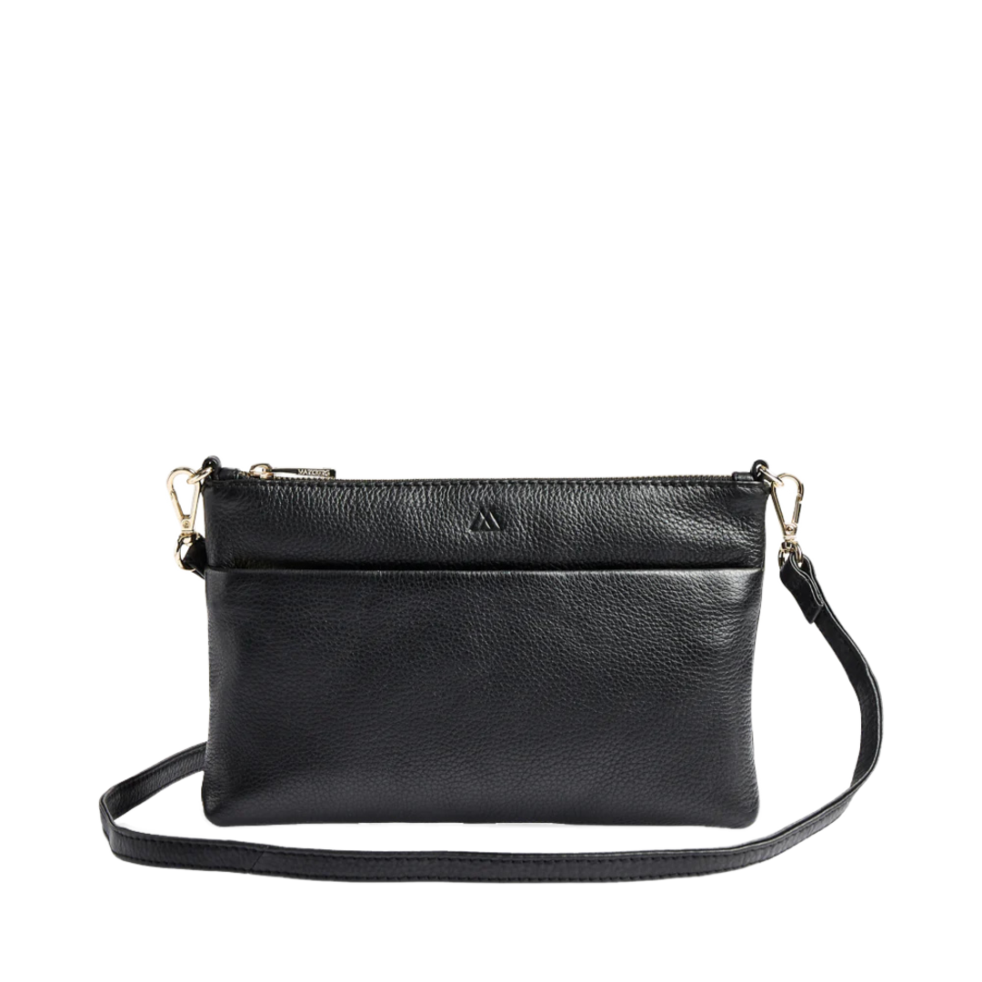 Front zip pocketLarge internal compartmentSecures with a zipRemovable and adjustable strap | KarimaMBG Crossbody Grain Black/Gold
