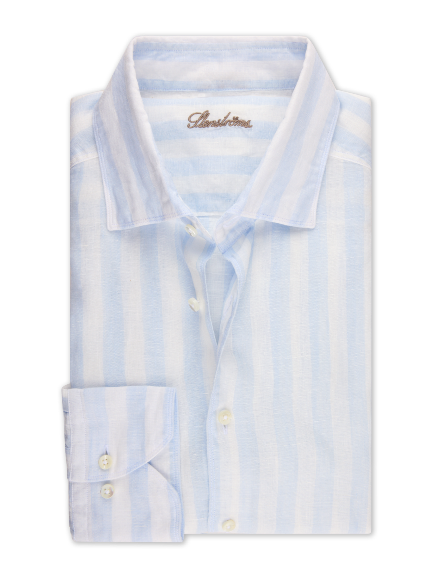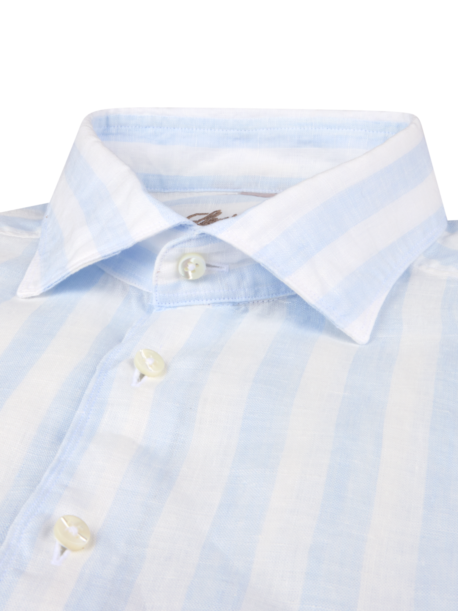 This striped shirt is made of linen and is detailed with mother of pearl buttons, single cuffs and a cut away collar. Moderate cut away collar, No.72 Single Cuff Mother of Pearl Buttons Linen 100%