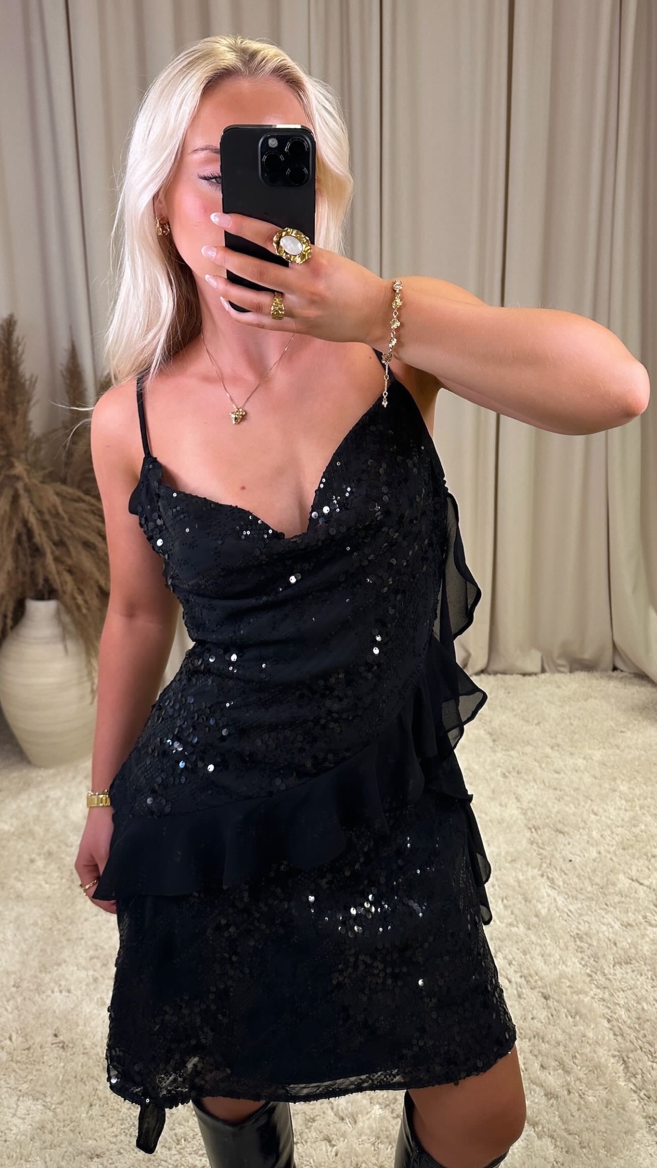 Æðislega fallegur pallíettu kjóll úr mjög þæginlegu chiffon efni, það er engin teygja í efninu og er með rennilás a hliðinni modelið er 160cm og er í stærð S