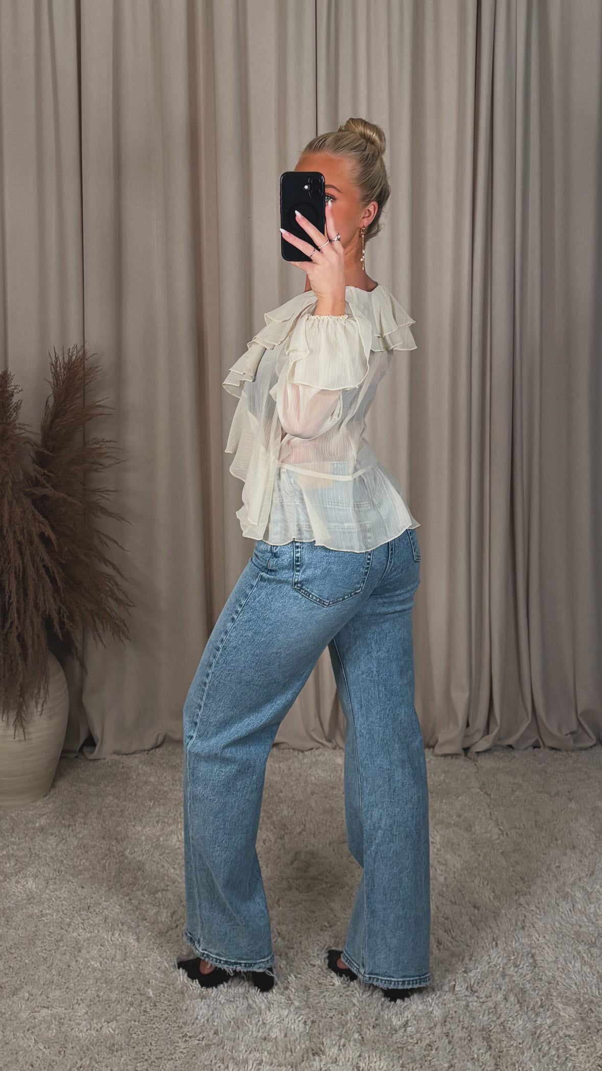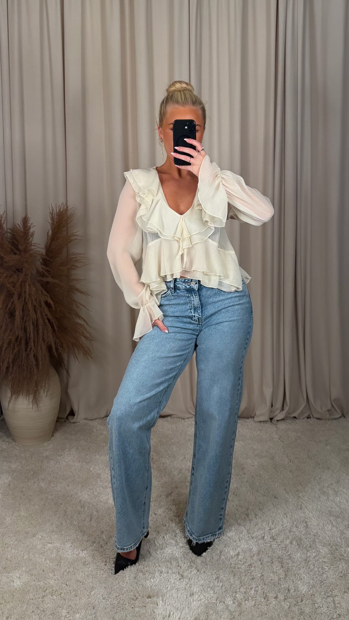 Æðislega falleg skyrta ur mjög þæginlegu chiffon efni, það er engin teygja í efninu módelið er 168cm og er í stærð S