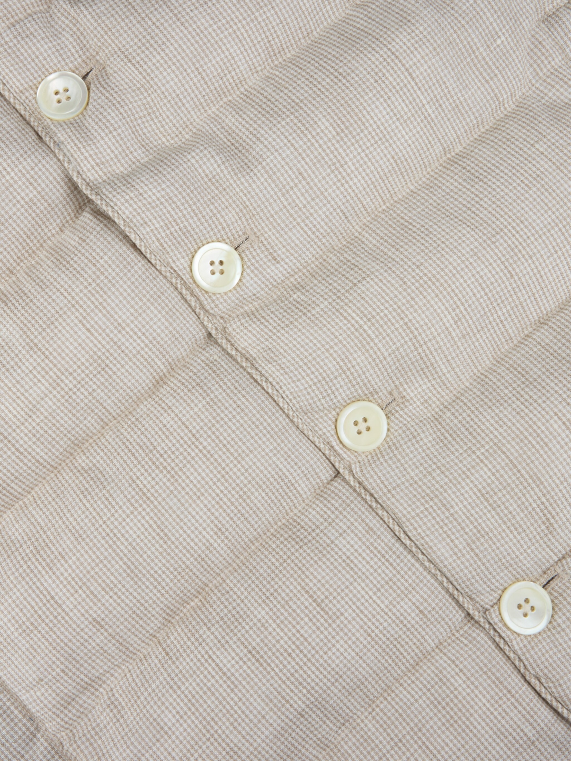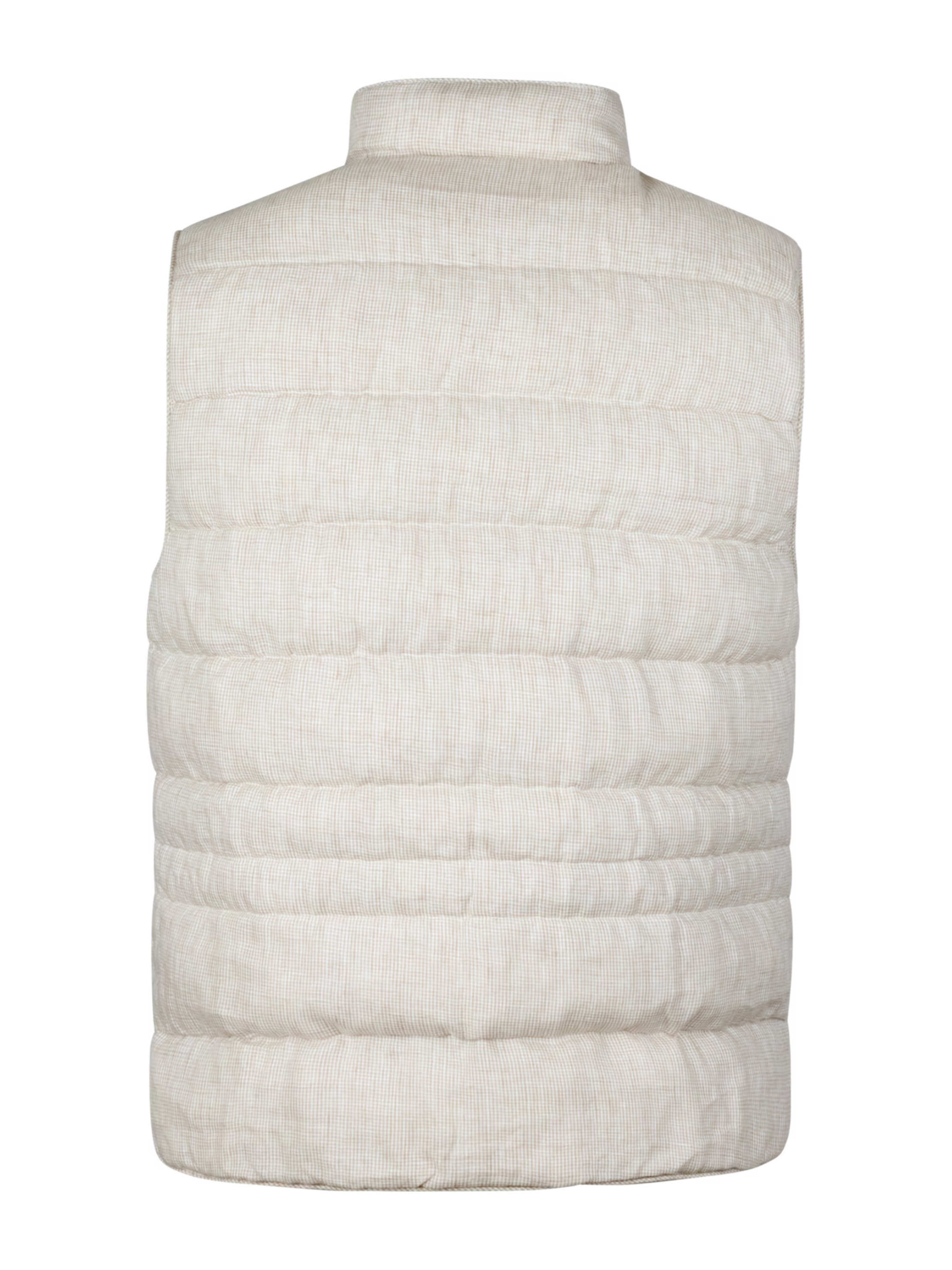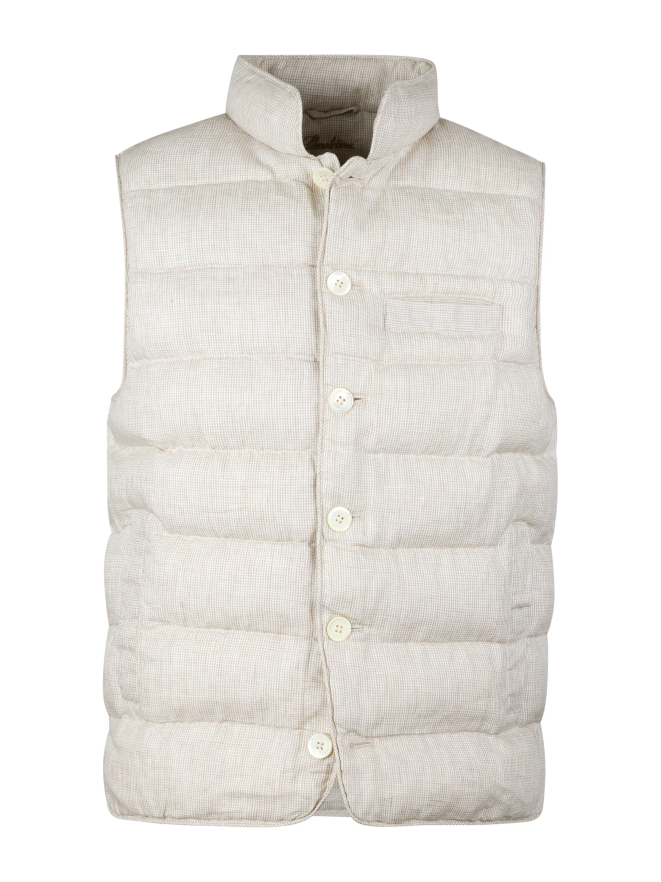 This padded vest is made of linen. Detailed with mother of pearl buttons and breast pocket. Sleeveless Mother of Pearl Buttons Linen 100%