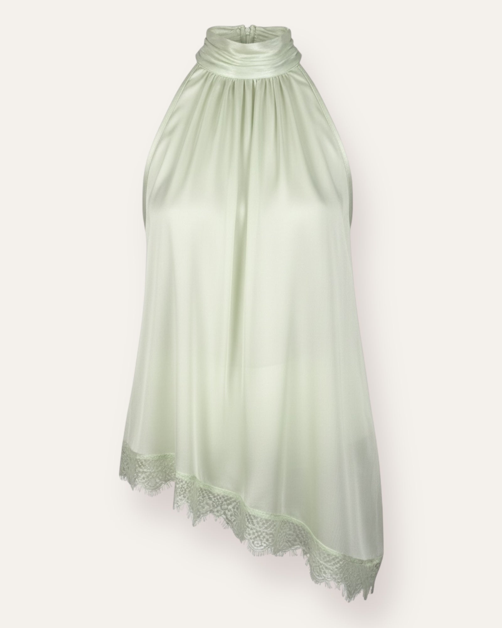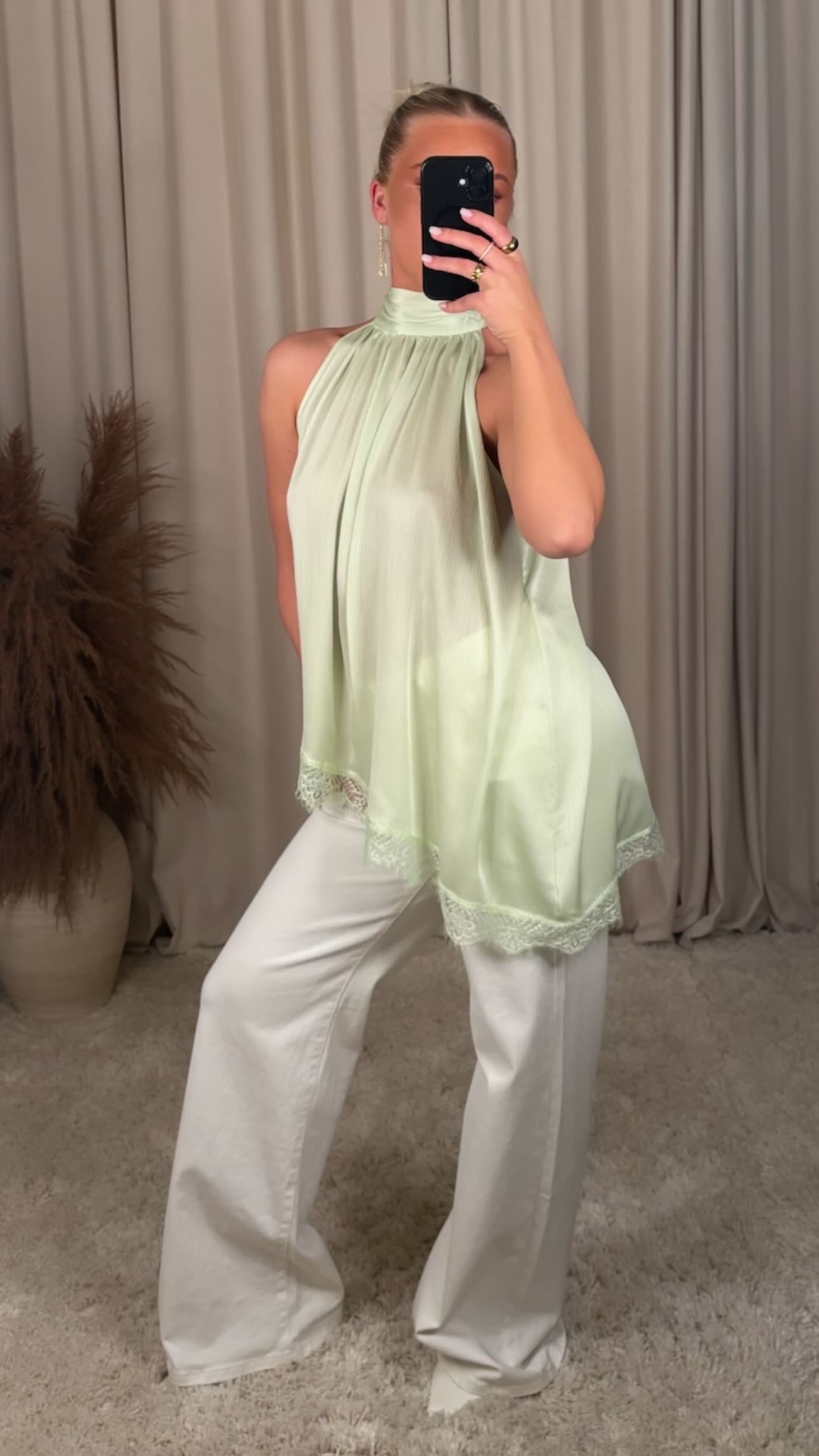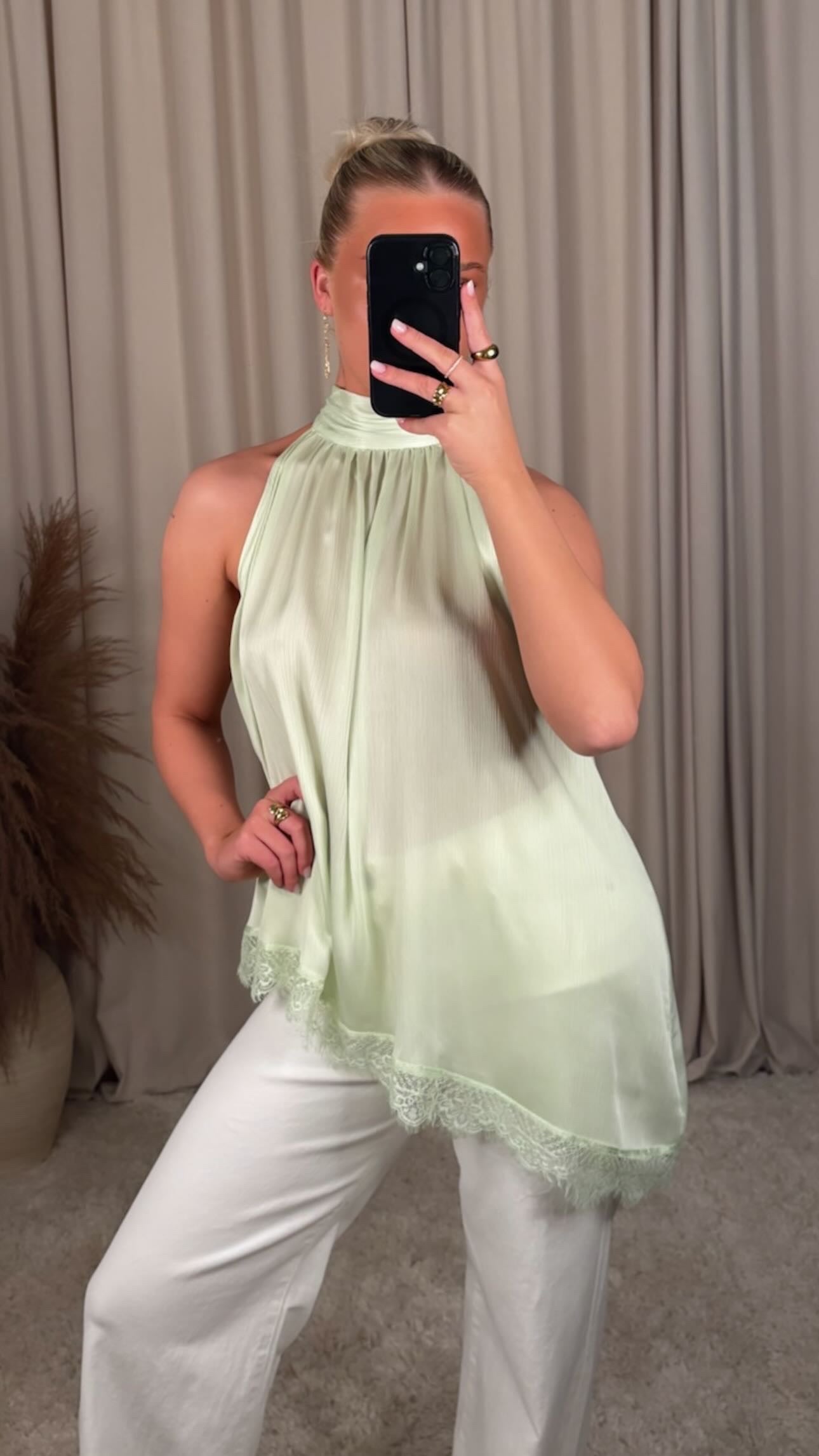 Æðislega fallegur bolur úr mjög mjúku satín efni, bolurinn er léttur og þæginlegur, og er bundin að aftan modelið er 168cm og er í stærð S