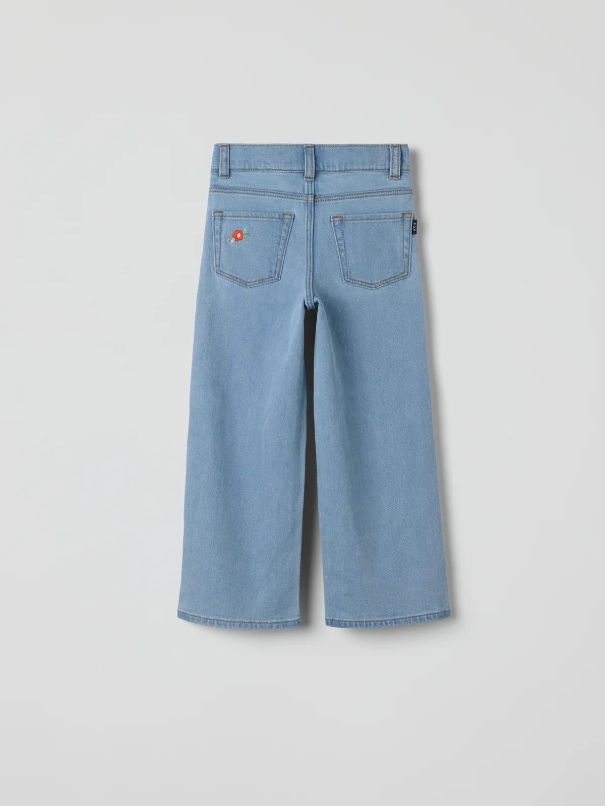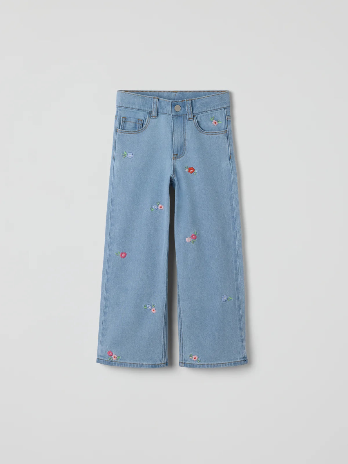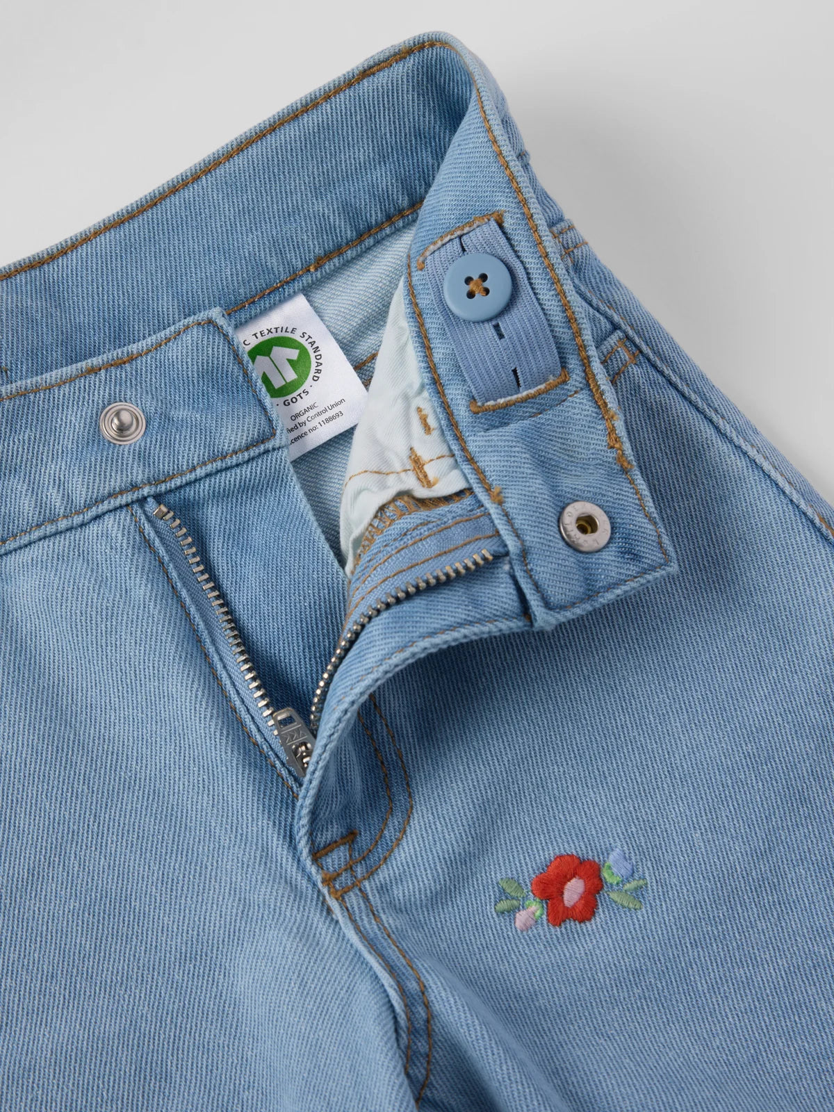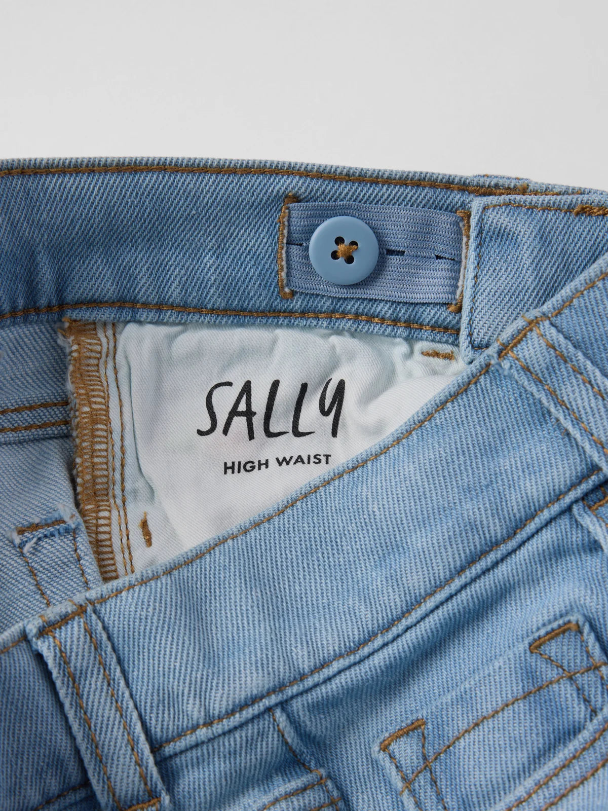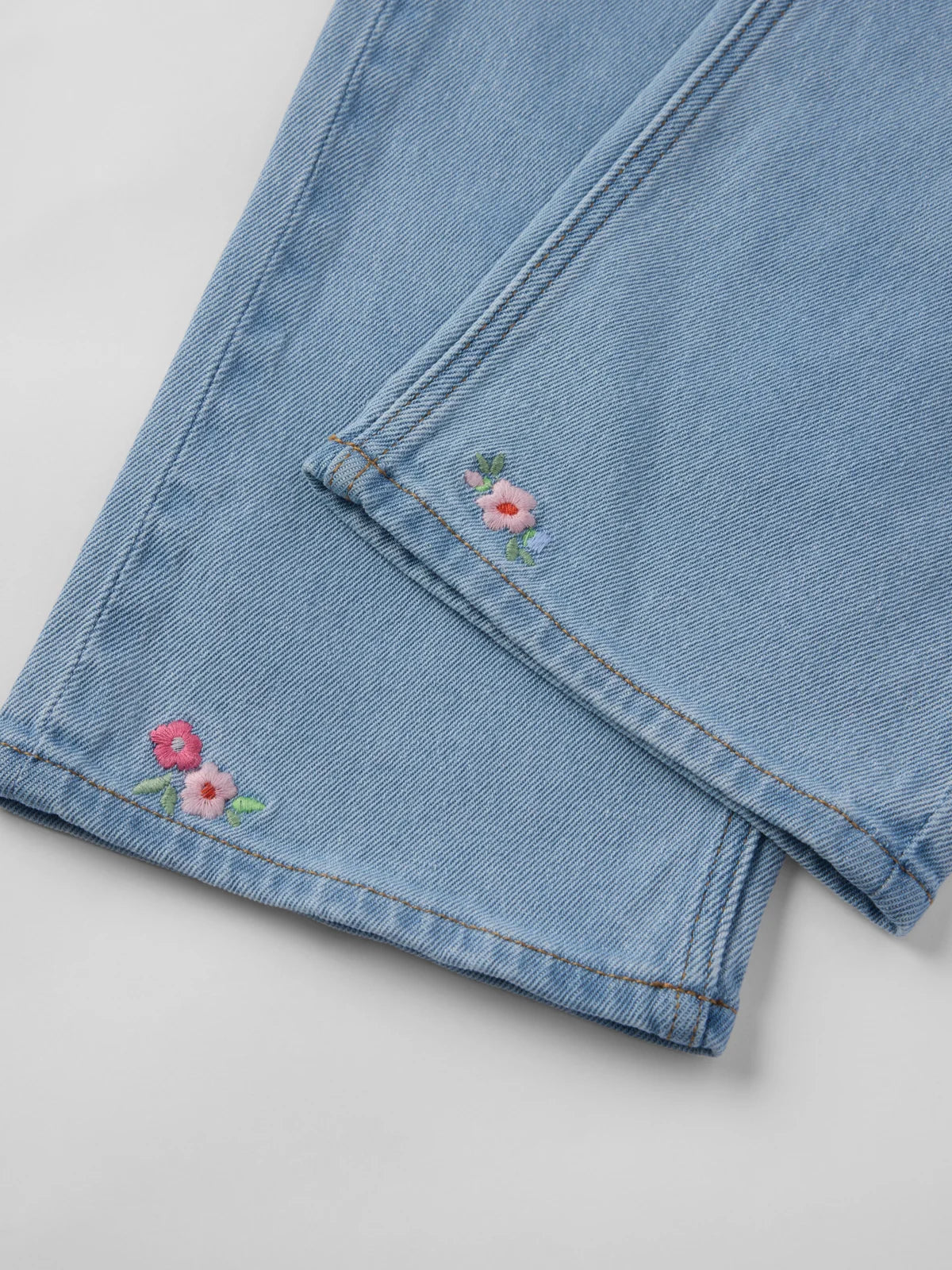 SALLY jeans Wide leg jeans Wide legs, high waist, soft stretch and cute embroidery Our stylish SALLY jeans, made in soft denim fabric with cute embroidery. Play-friendly jeans with wide legs ... Sjá nánar