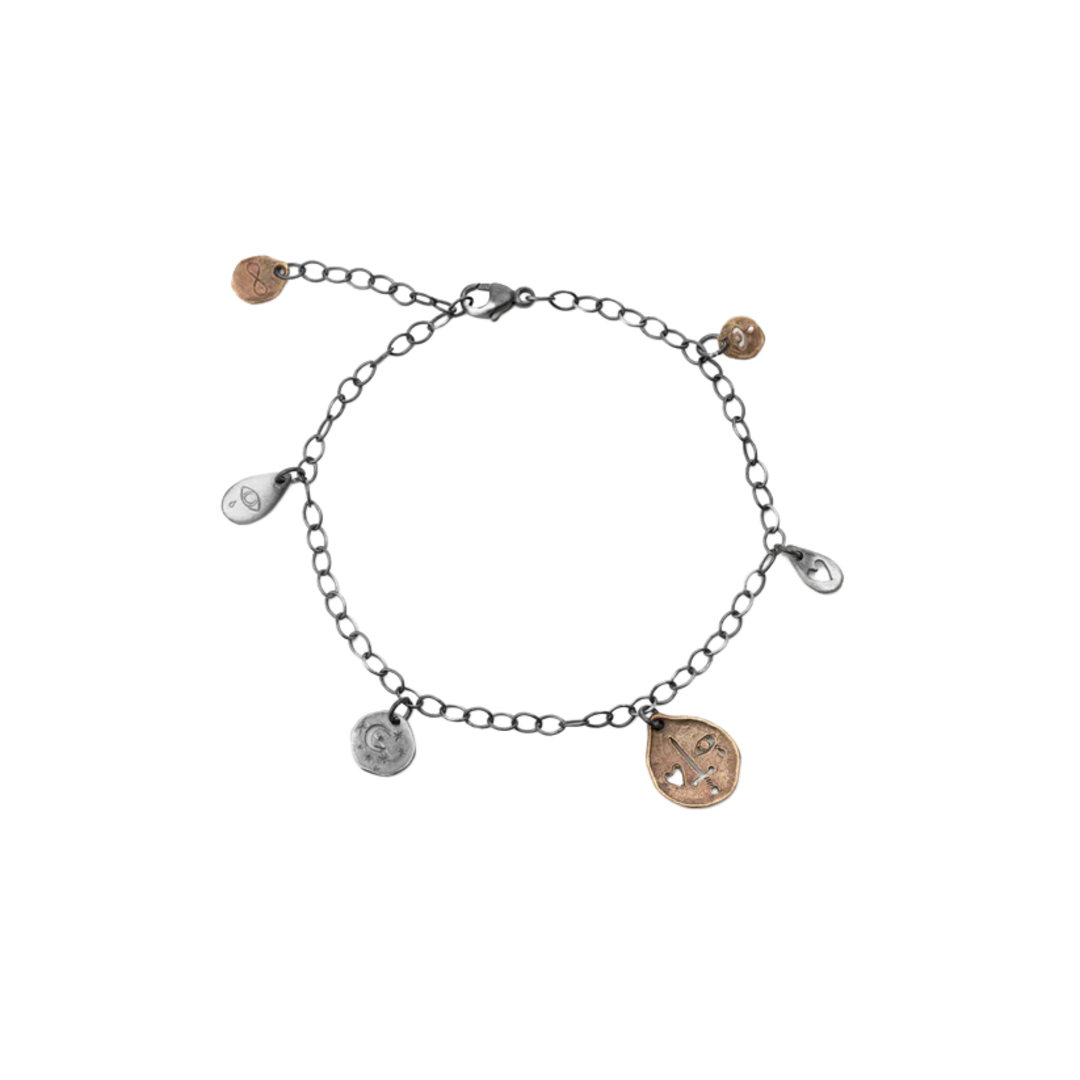 An oxidized silver chain with 6 coins / tears with each a different silver or bronze symbol engraved or carved out.The silver clasp can be clasped wherever on the chain so the bracelet can be ... Sjá nánar