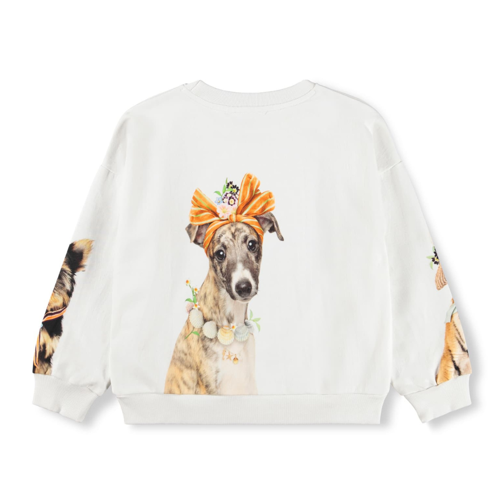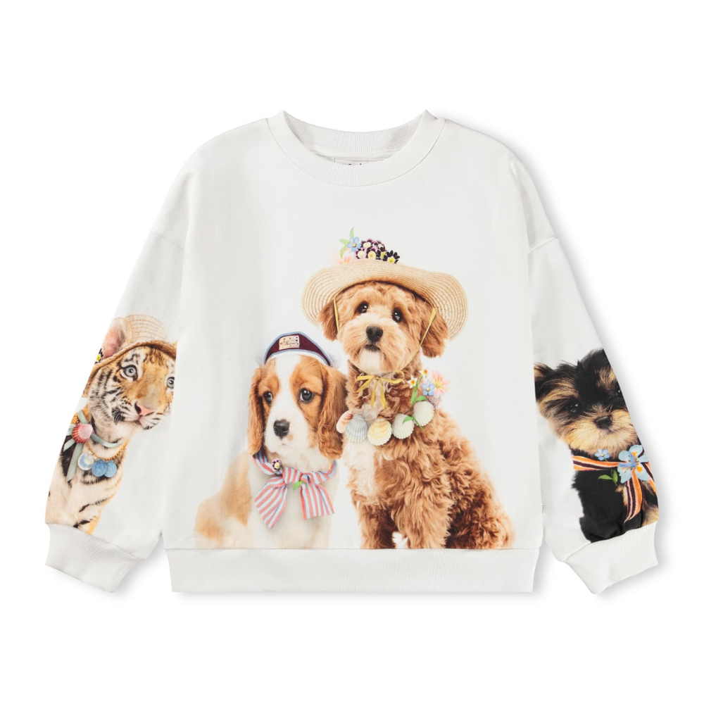 Ljós Molo peysa með sætum myndum. Stroff við ermar og mitti. 100% bómull.