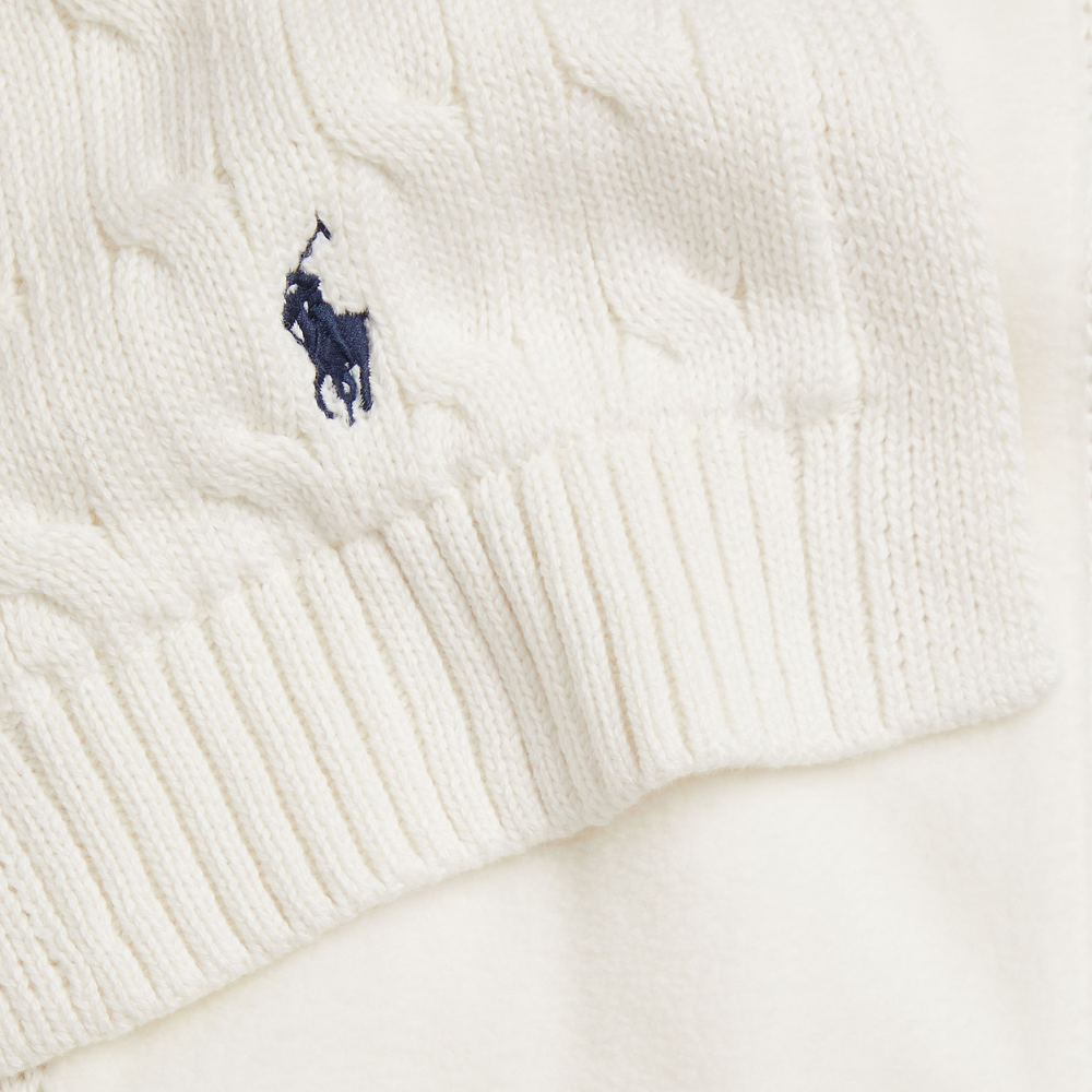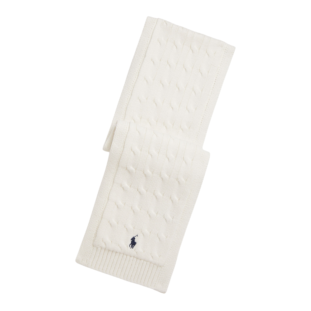 Hvítur trefill með kaðlamynstri og litlu, dökk bláu logo að framan. 100% bómull.