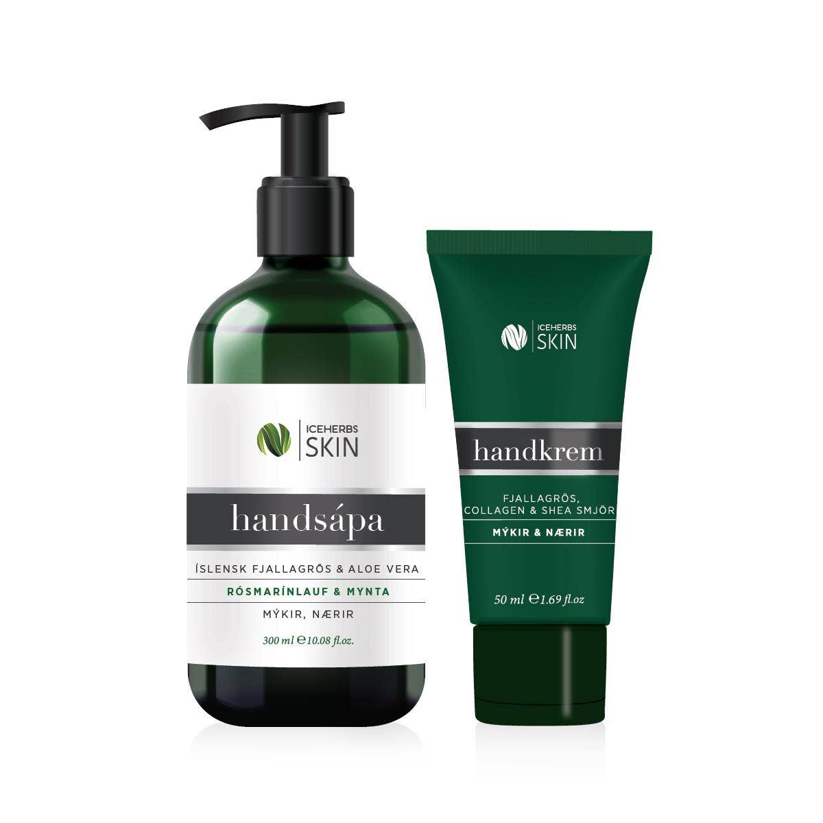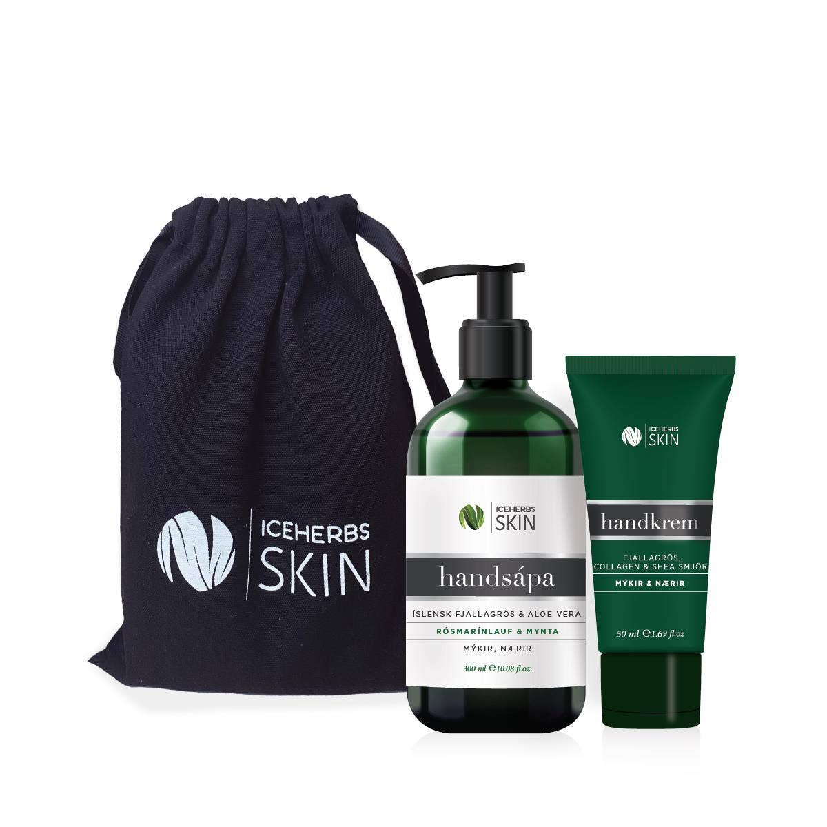 Í þessum fallega gjafapoka má finna ICHERBS SKIN handkrem með fjallagrösum, collageni og Shea Smjöri (50 ml) ásamt ICEHERBS SKIN handsápu með ilm af rósmarínlaufum og myntu 300 ml.)