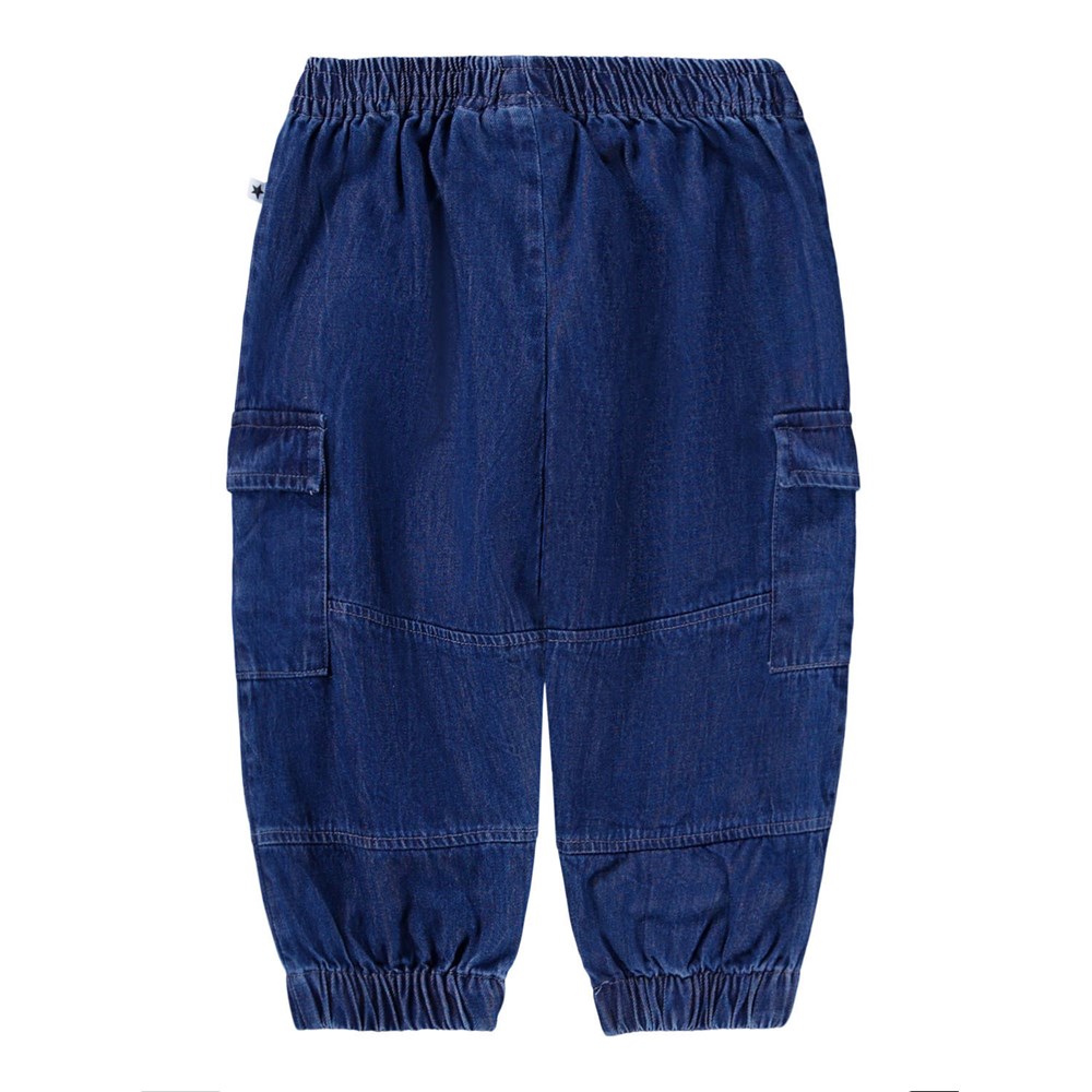 Mjúkar, dökkar gallabuxur frá Molo með hliðarvösum og teygju við mitti og skálmar. 100% bómull.