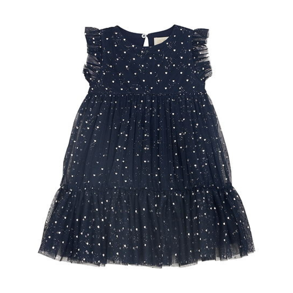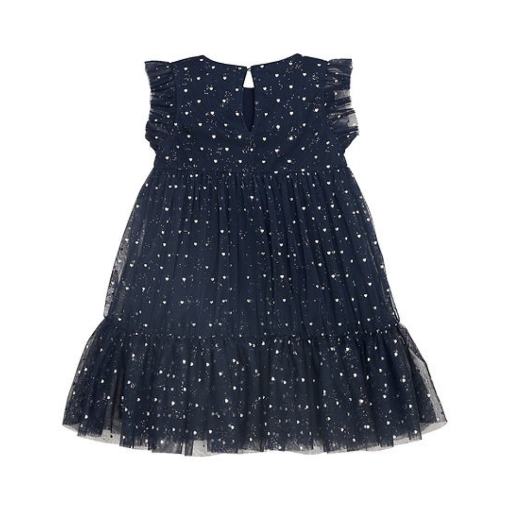 Fallegur, dökk blár, ermalaus kjóll frá Creamie með silfruðu pallíettu skrauti. 100% polyester.