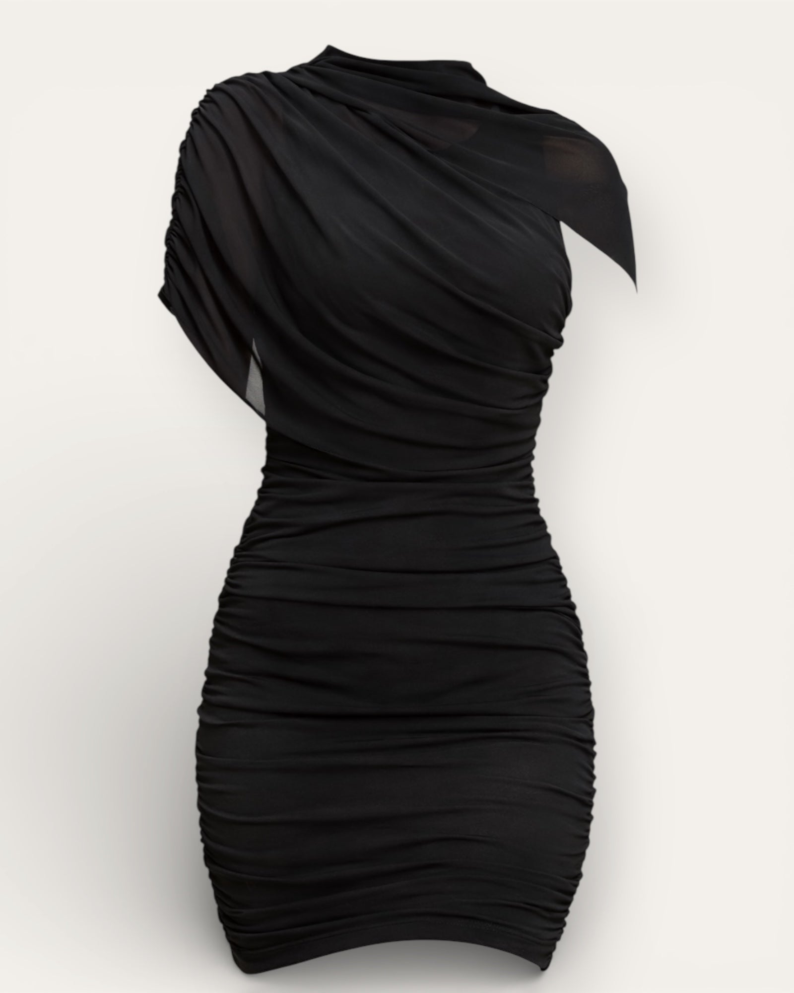 Midnight Drape Mini Dress Fágaður og einstaklega kvenlegur svartur mini kjóll með fallegum rykkingum sem móta líkamann á smekklegan hátt. Ósamhverft hálsmál og mjúk drapering yfir axlir gefa ... Sjá nánar