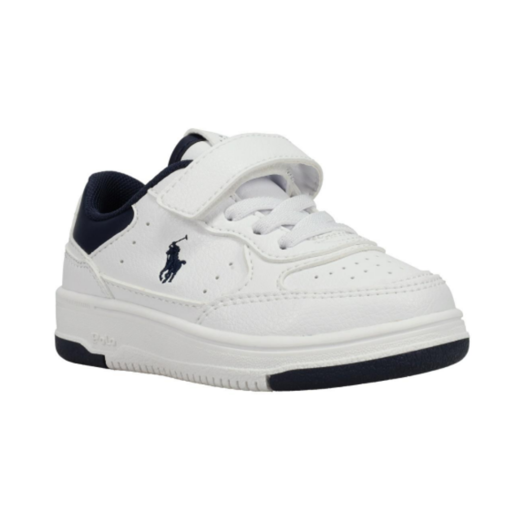 Hvítir og dökk bláir strigaskór frá Polo Ralph Lauren með útsaumuðu logo á hliðum. Skórnir lokast með frönskum rennilás.