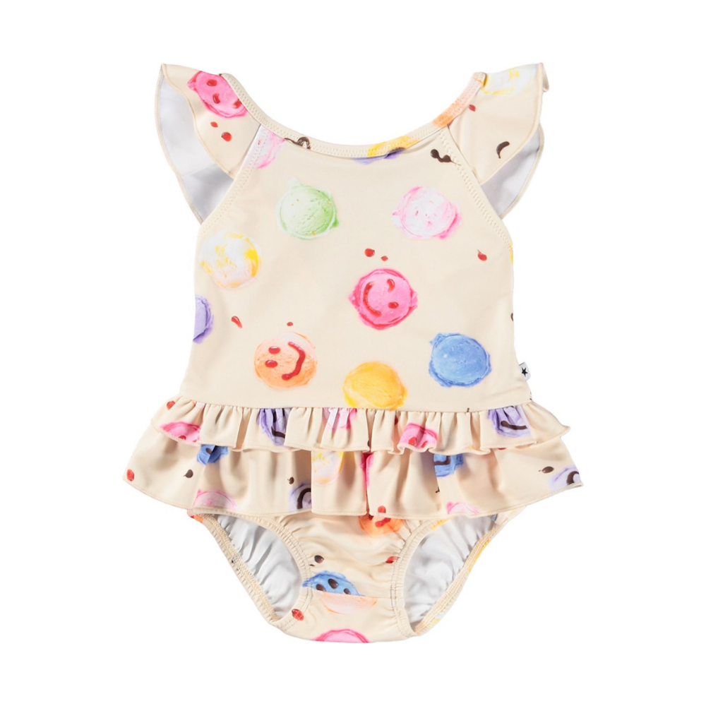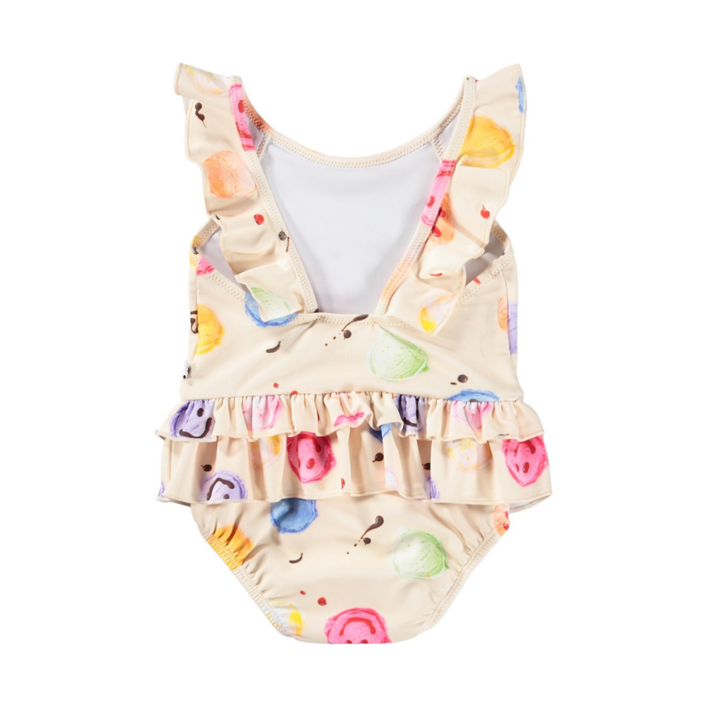 Fallegur sundbolur frá Molo. Pífu hlýrar og pífa yfir mittið gerir hann extra sætan. Gott pláss fyror sundbleiu. UV50+ sólarvörn gegn geilsum sólarinnar. 80% polyester og 20% elastane.