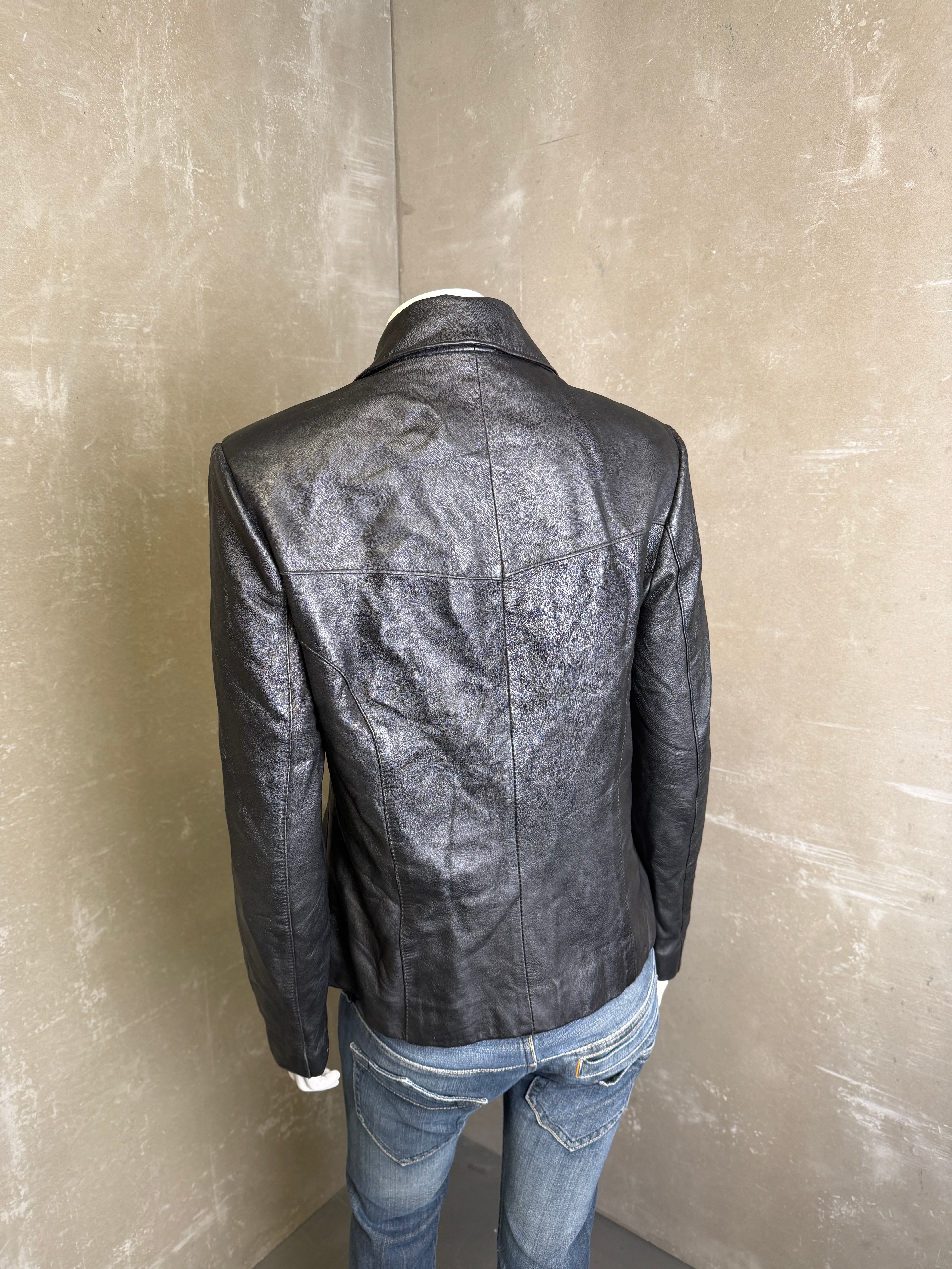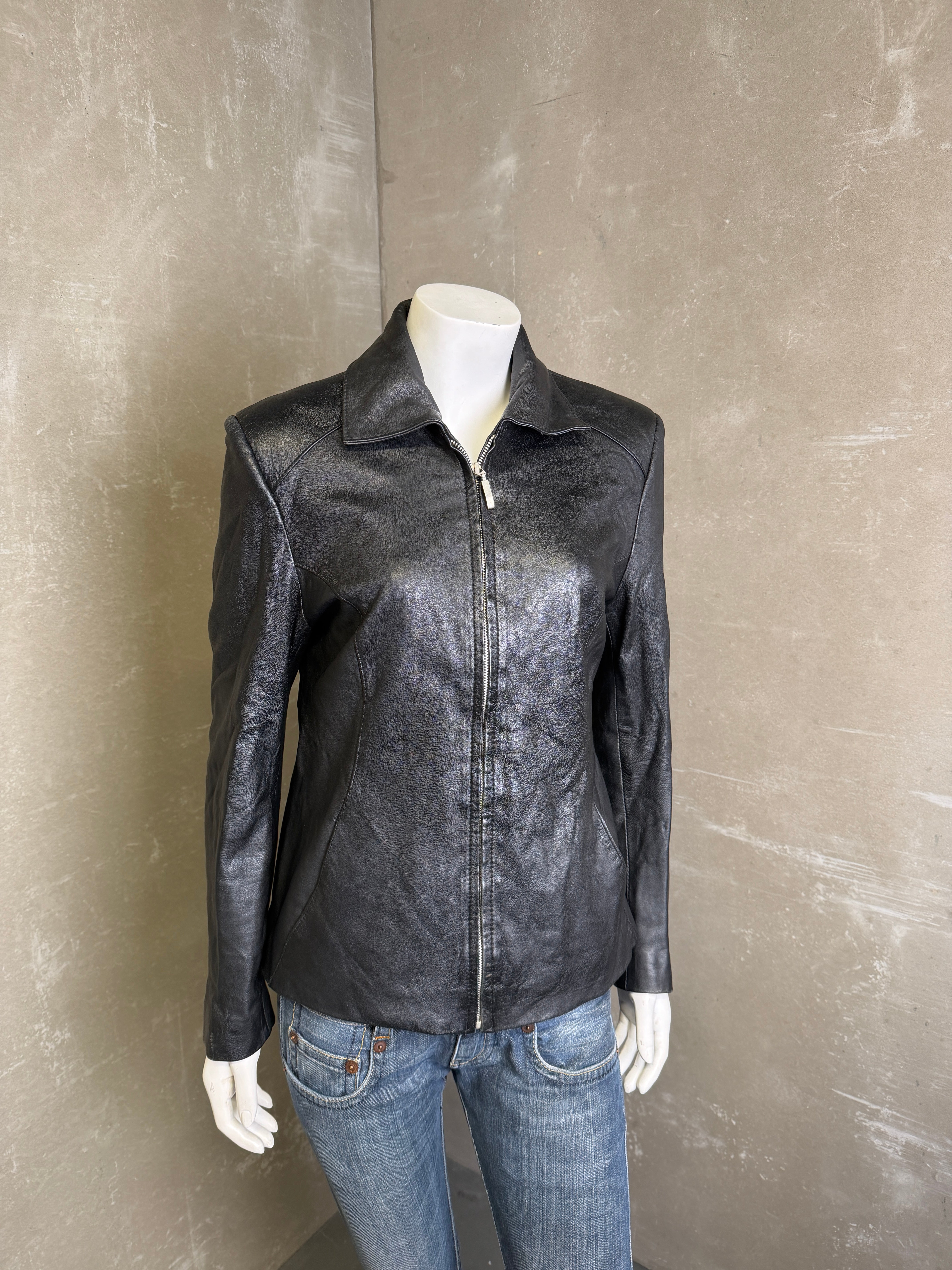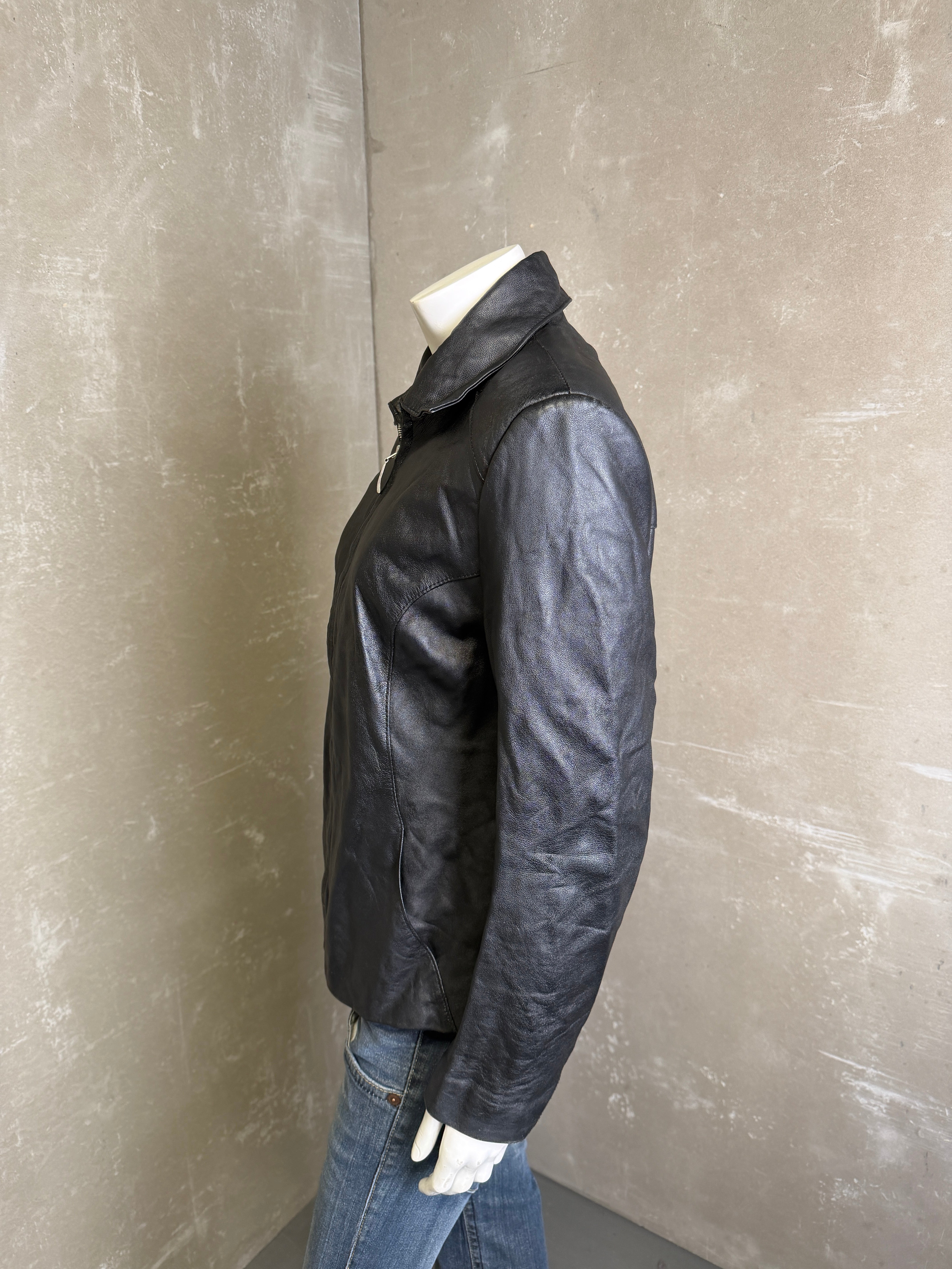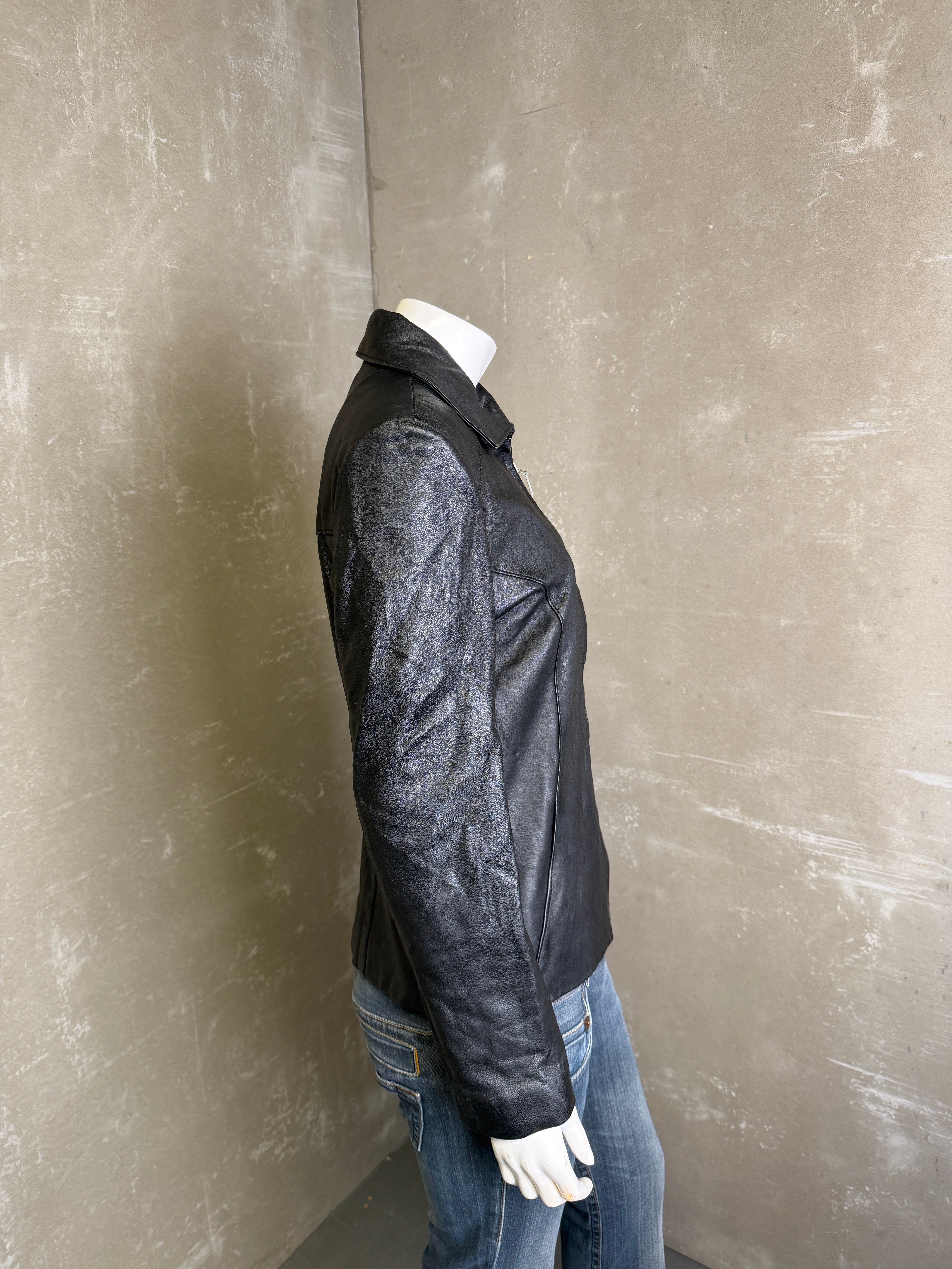 Leðurjakki Fittar S  Gína er 170 hæð í stærð S. Vintage flíkur geta sýnt ummerki um notkun  Vara einungis fáanleg í netverslun Nr53