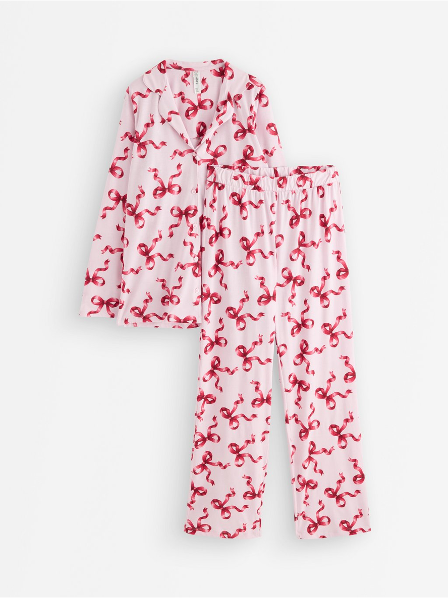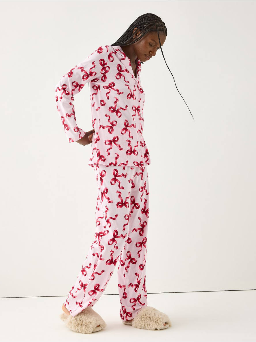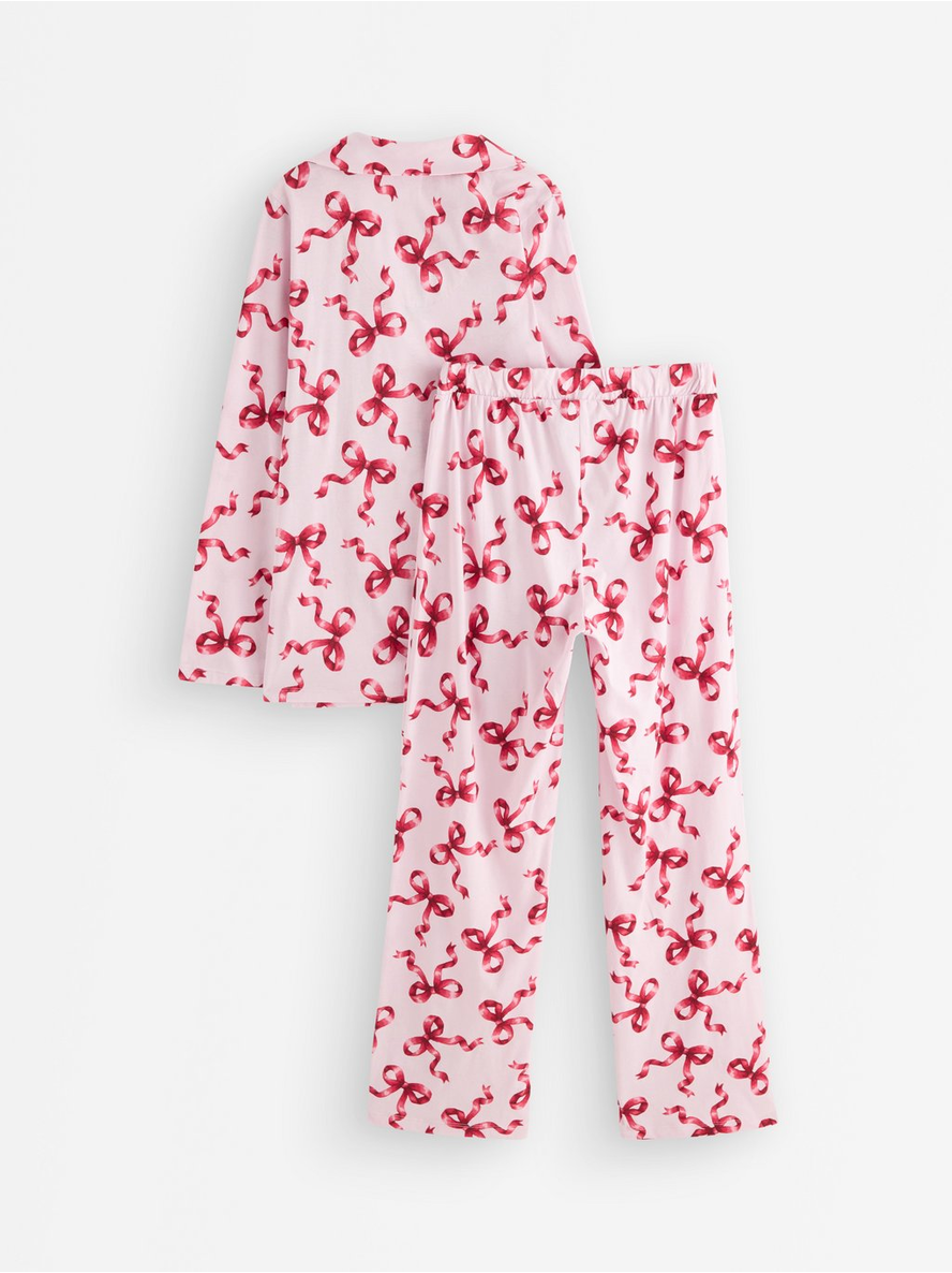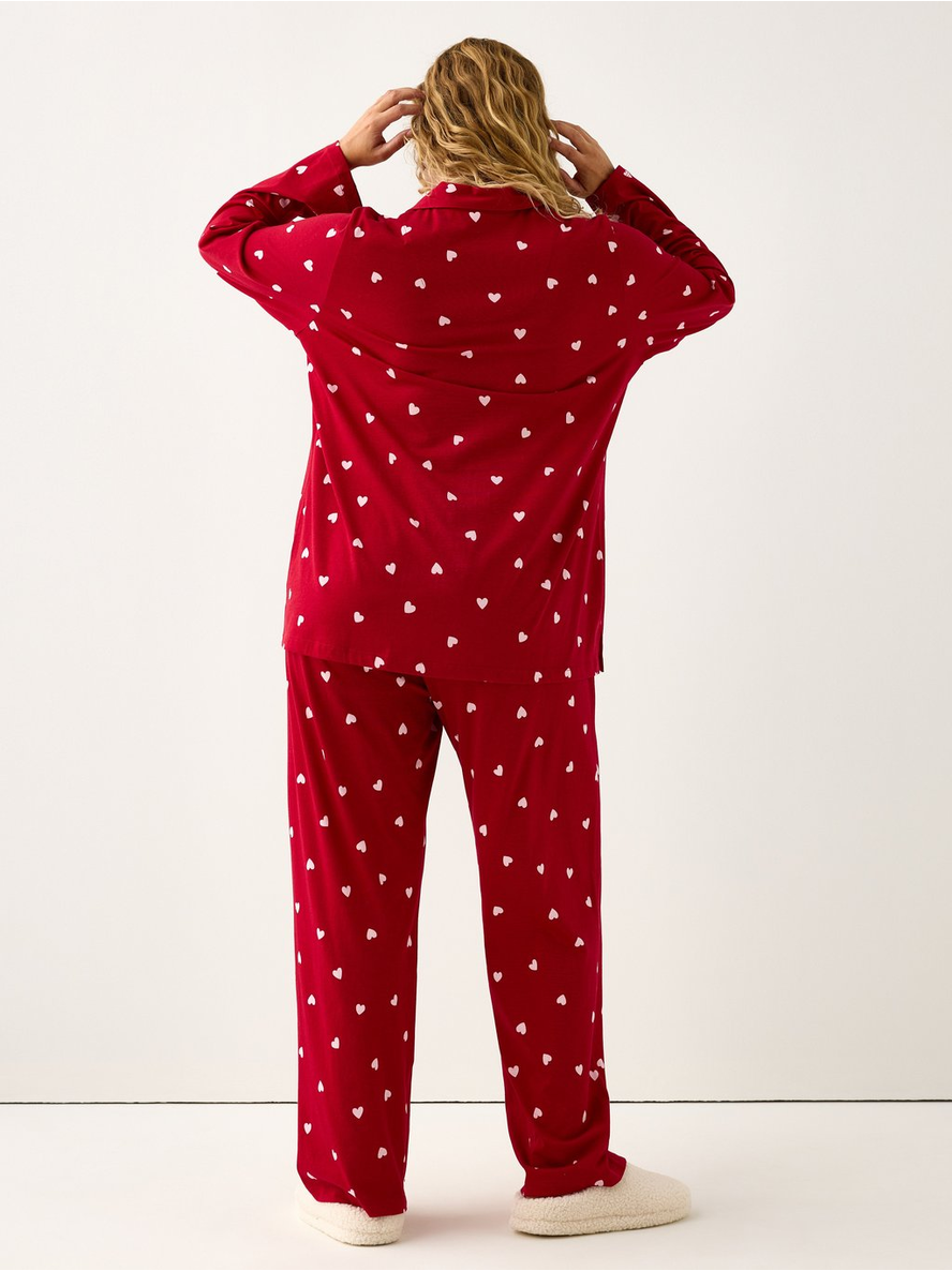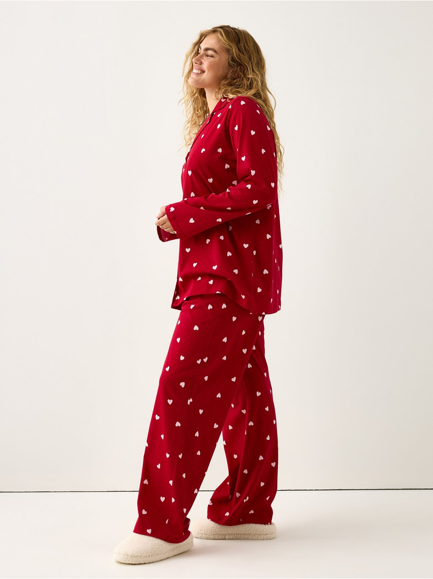 Pyjama set with a shirt and matching trousers. Long sleeves Collar Button closure Contains 80% organic cotton Contains 20% recycled cotton Inside leg measurement 77 cm on all sizes Sjá nánar