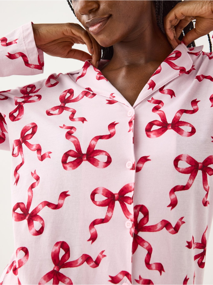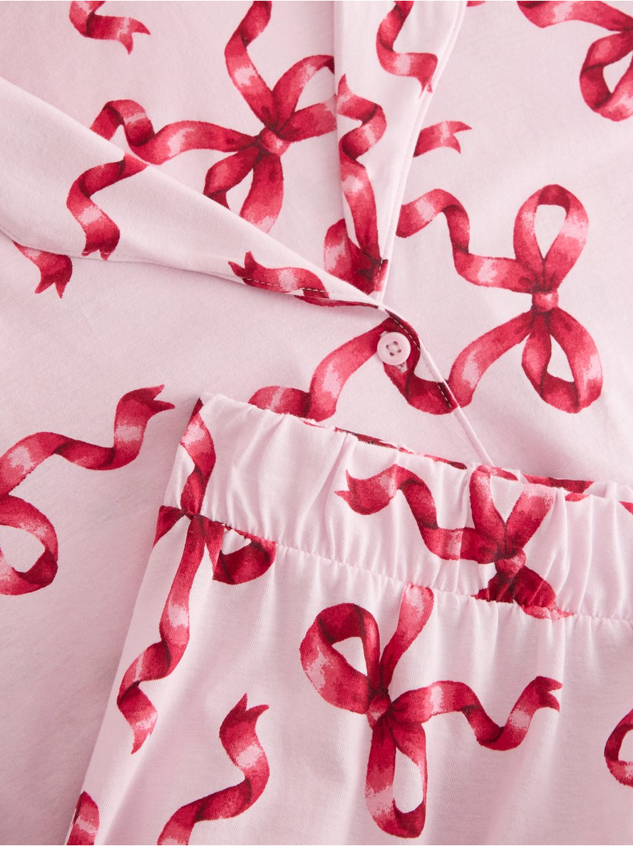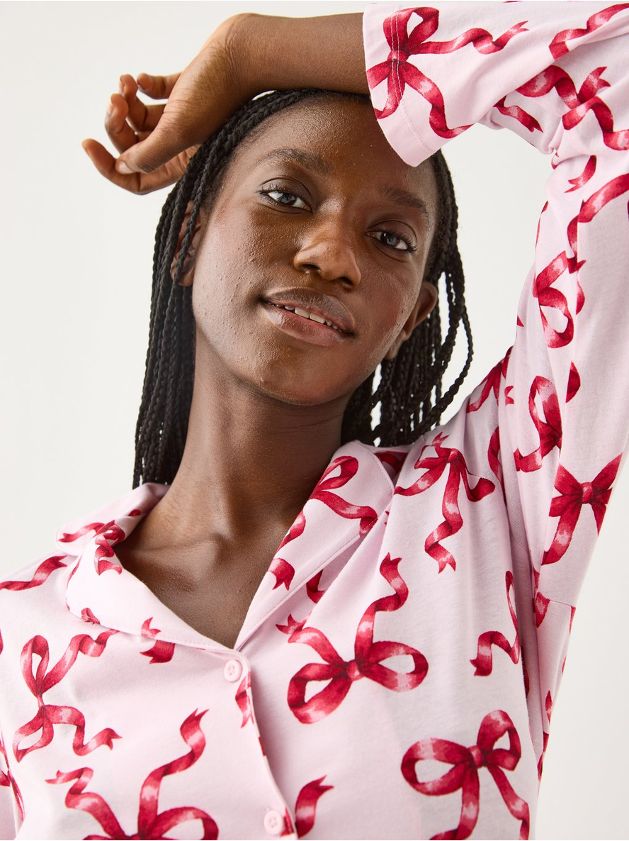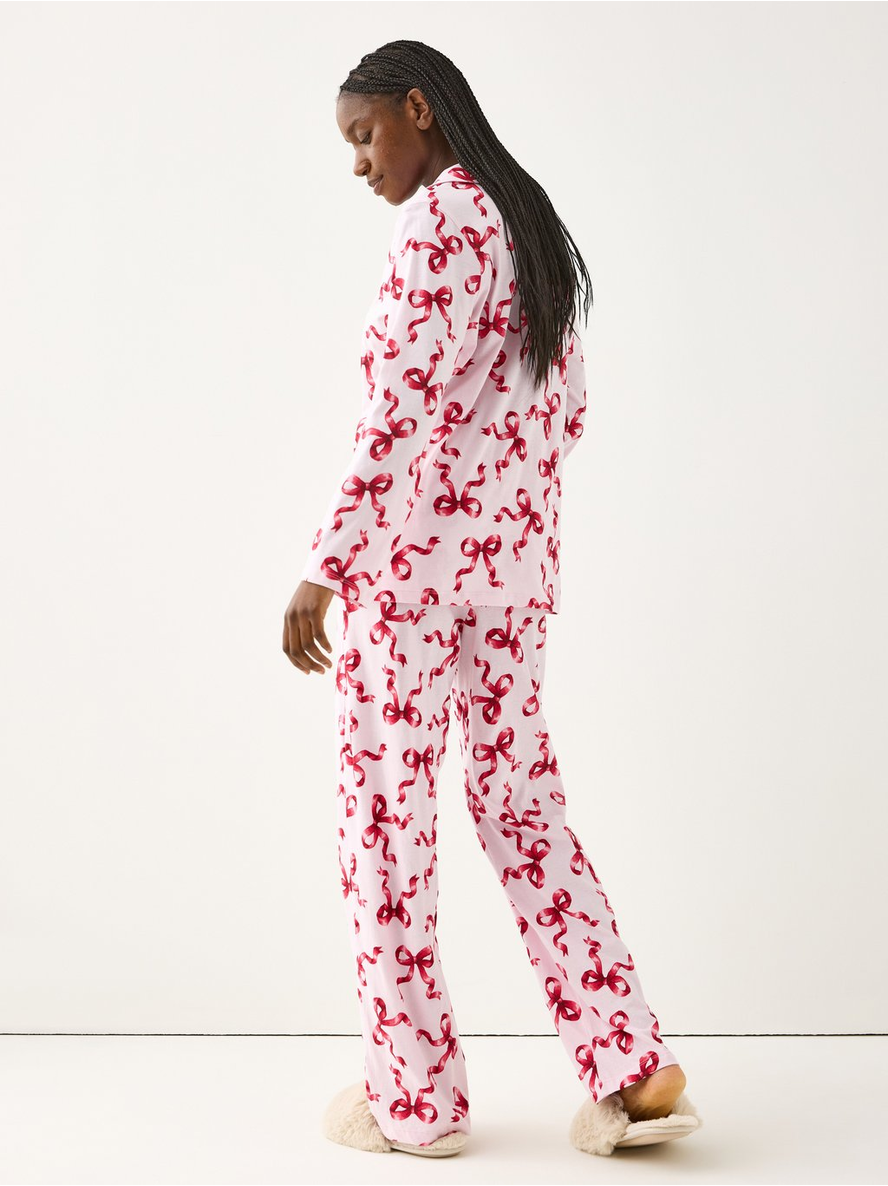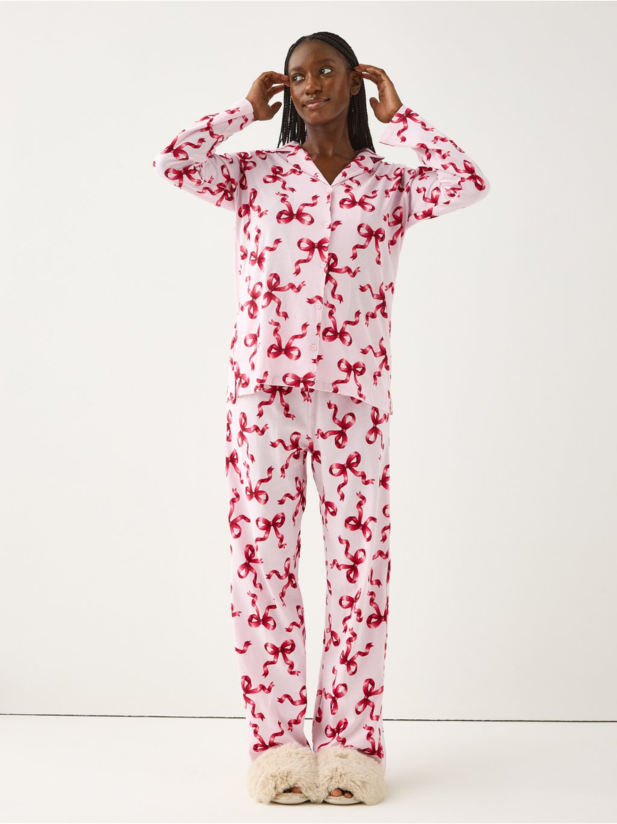 Pyjama set with a shirt and matching trousers. Long sleeves Collar Button closure Contains 80% organic cotton Contains 20% recycled cotton Inside leg measurement 77 cm on all sizes Sjá nánar