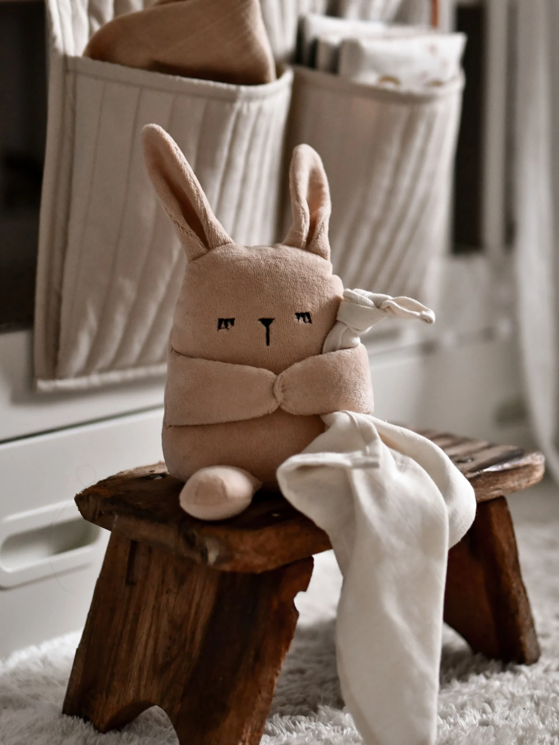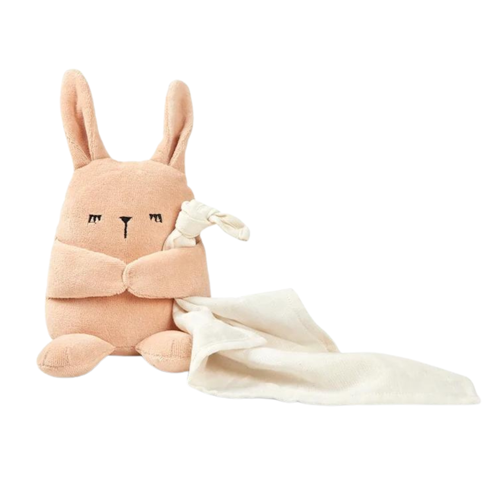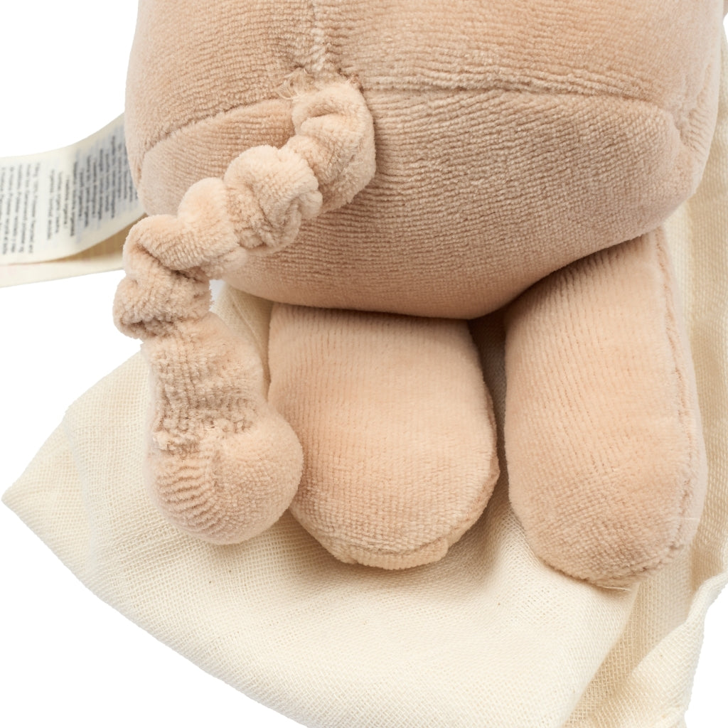 Sætur og mjúkur bangsi með kúruklút sem spilar tónlist. Stærð, 12x18cm. 100% lífræn bómull og fyllt með polyester.