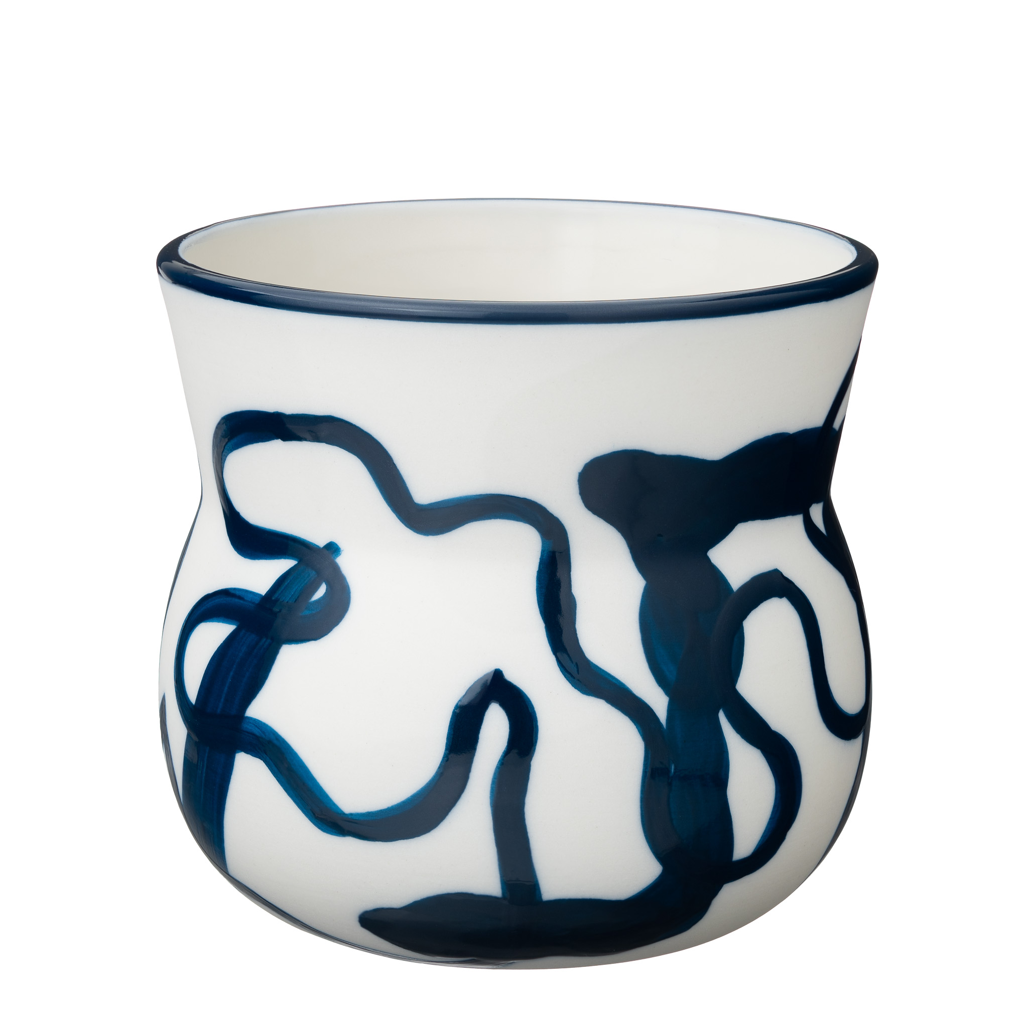 Handgerður blár Veltibolli úr postulíni, sem þolir vel uppþvottavélar og örbylgjuofna. Bollinn hefur þann eiginleika að hitna ekki efst þegar hellt er í hann allt að 150 millilítrum.