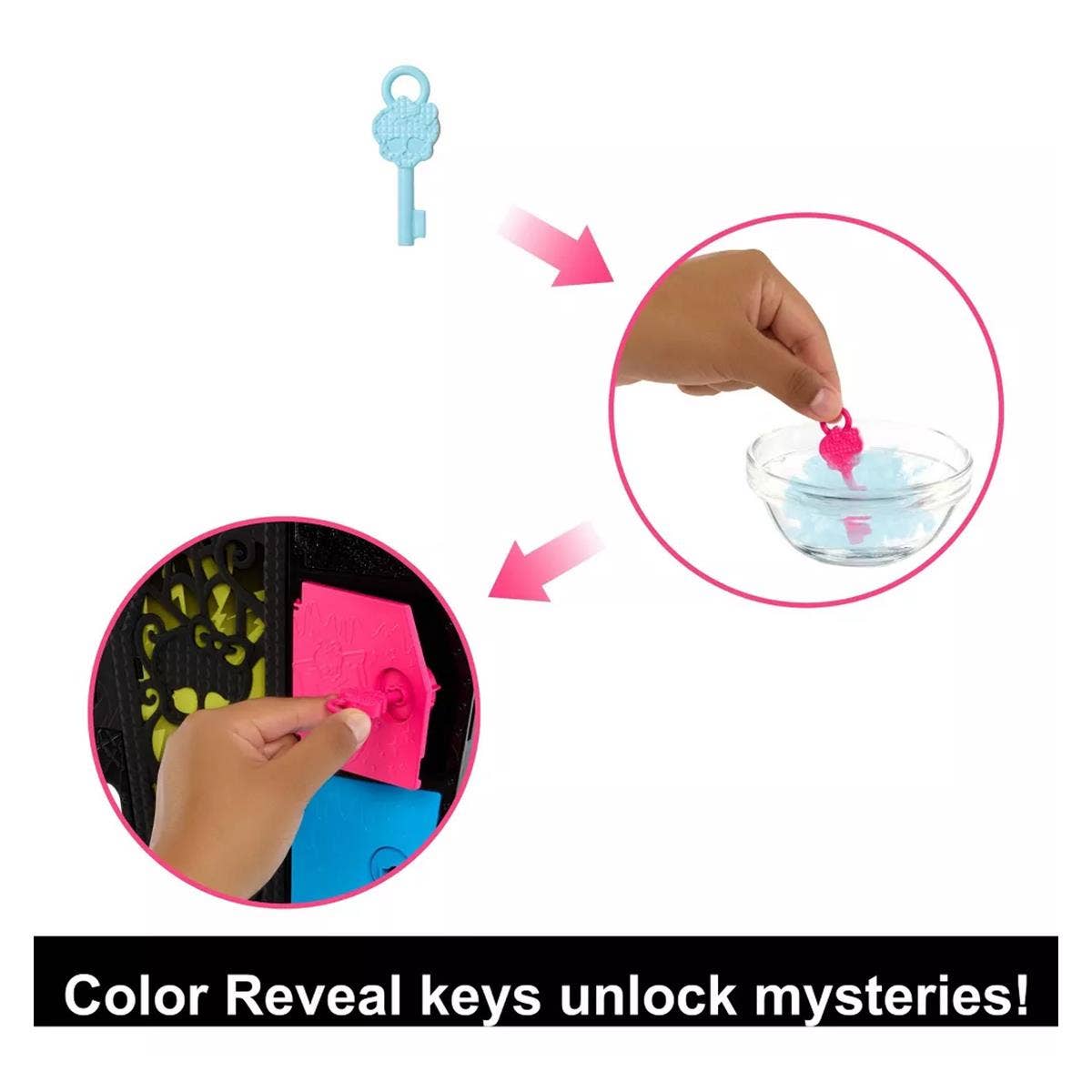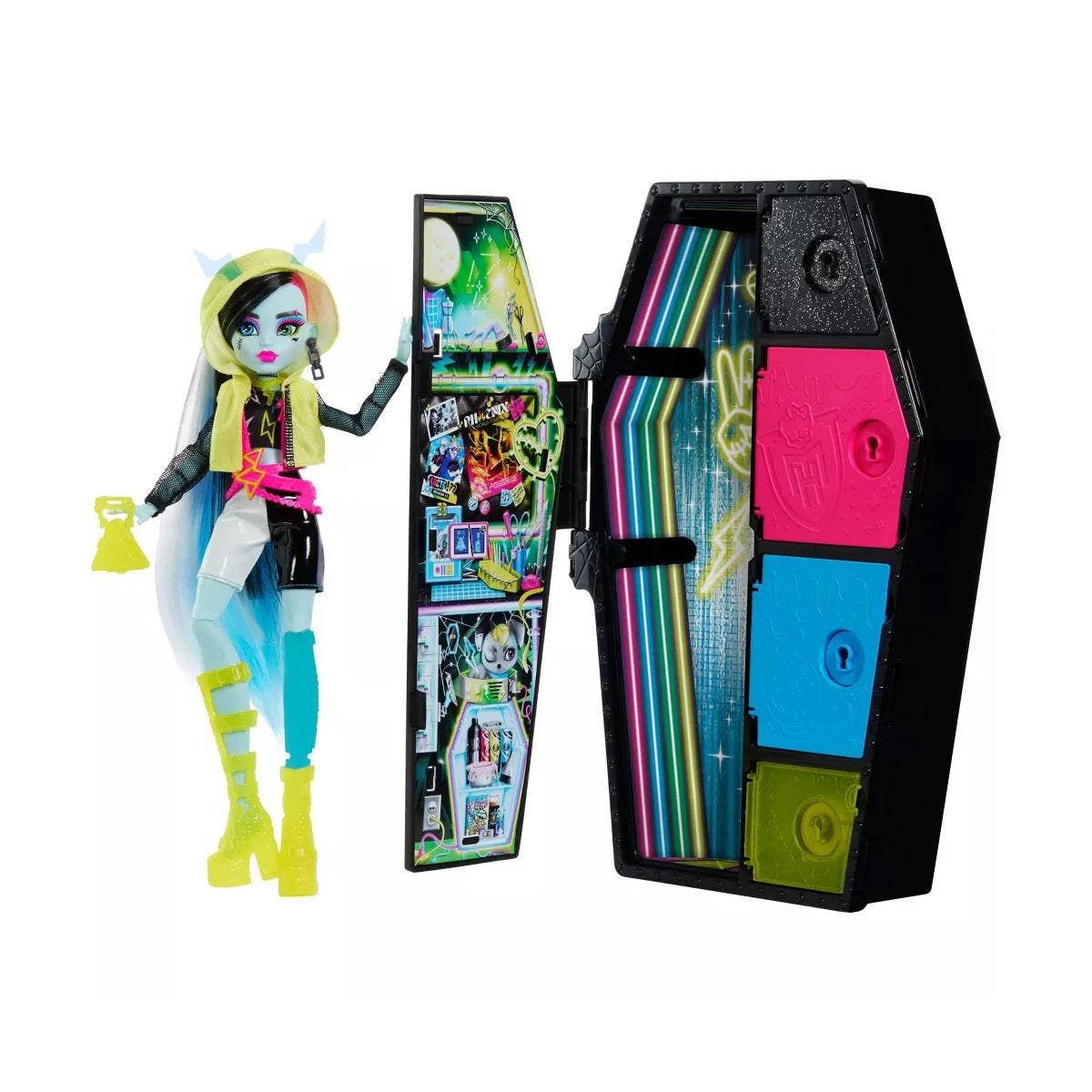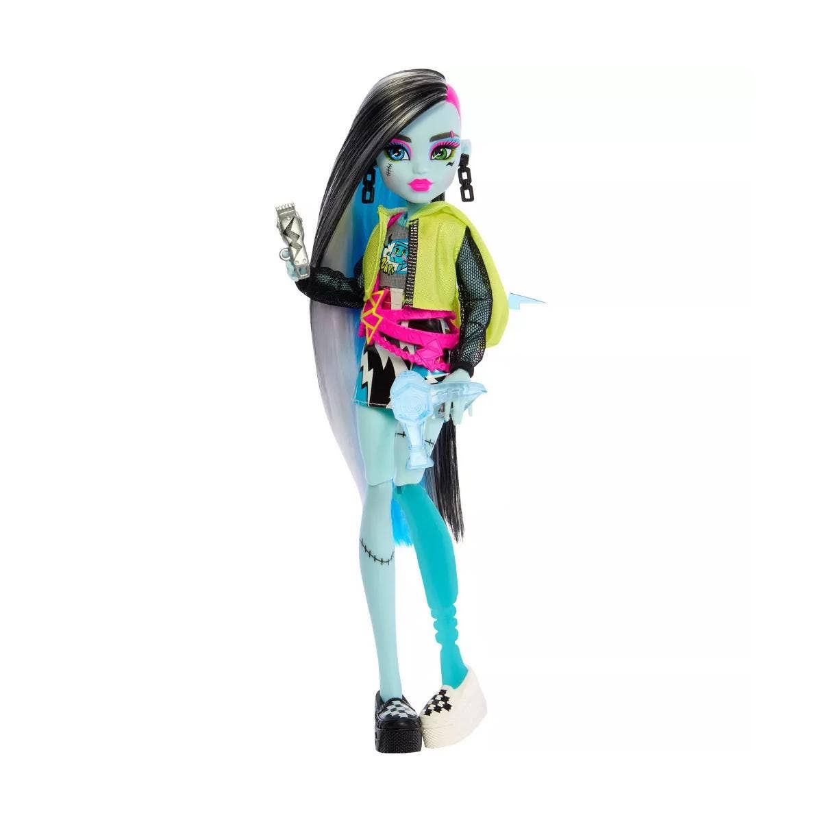 Skemmtileg neon útgáfa af Frankie Stein úr Monster High ásamt fylgihlutum sem lýsa í myrkri.